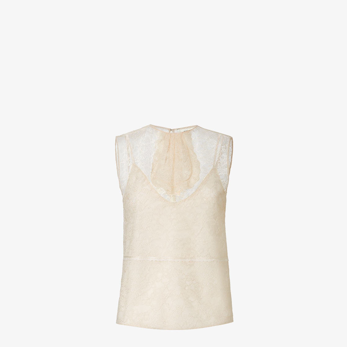 크루넥 슬리브리스 탑. 뒷면에 스몰 버튼 달린 티어 드롭 잠금. 라이트 핑크 컬러의 레이스 소재. 트리밍 디테일 및 앞면의 톤온톤 레이스 자보 모티프 피니시. 매칭 실크 슬립 탑, 가느다란 숄더 스트랩 및 V넥.