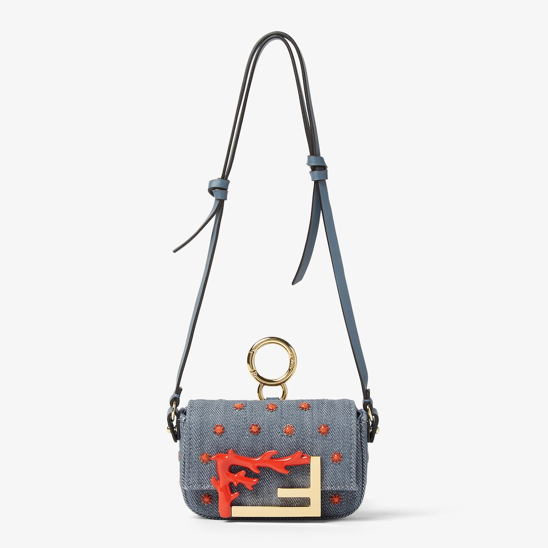 플랩과 마그네틱 클로저가 달린 FF 잠금 디자인의 아이코닉 바게트 백의 나노 버전. 클립이 있어 대형 백 또는 벨트에 참으로 연결 가능. 가느다란 조절 및 탈착 가능한 가죽 숄더 스트랩을 사용해 팔 아래 끼우거나 손에 들 수 있음. 내부의 플랫 신용카드 홀더 포켓. 레드 컬러 데이지 자수의 블루 데님 소재. 레드 에나멜 소재의 FF 버클에 더한 코랄 형태의 디테일. 골드 피니시 메탈웨어.