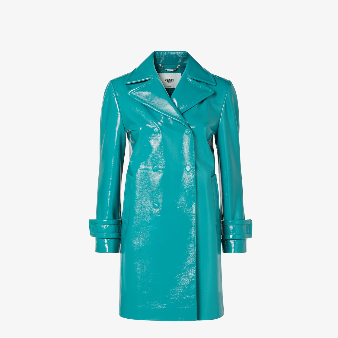 스트레이트 컷 미디 트렌치 코트. 라펠 칼라와 7부 소매, 커프 스트랩. 웰트 사이드 포켓. 컨실드 스냅 버튼식 잠금. 글로시 피니싱의 부드러운 터쿼이즈 컬러 가죽 소재. 안감 처리. 엠보싱 FF 로고를 더한 웨이스트 뒷면의 마르탱갈 장식.