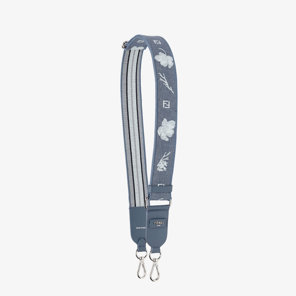 더블 클립이 있는 길이 조절 가능한 롱 숄더 스트랩. 후크가 있는 백과 함께 사용 가능. 코튼 자카드 소재. 한 면은 데님 블루 플로럴, 코랄, 마이크로 FF 디자인, 다른 면은 스트라이프 모티프. 톤온톤 가죽 디테일 장식. 끝 부분의 메탈 Fendi Roma 레터링 장식. 팔라듐 피니시 메탈웨어.