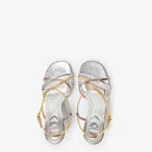 발을 감싸는 가느다란 스트랩의 샌들. 발목 옆면의 스몰 버클. 메탈 FF 디테일과 중앙의 기능적인 힌지가 포함된 특별한 디자인으로 편안한 착용감을 선사합니다. 실버, 골드, 코퍼 톤의 메탈릭 에이어스 소재. 실버 컬러의 가죽 인솔 및 골드 피니시 메탈웨어.