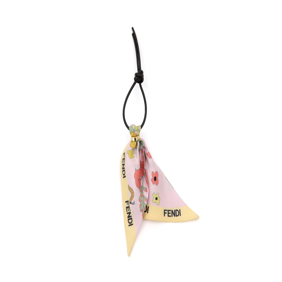 펜디 향수 보틀을 커스터마이즈할 수 있는 트윌리 참. 컬렉션의 캔디 핑크 컬러 플라워 모티프가 프린트된 실크 소재, 24캐럿 골드 플레이트 링 장식. 대조적인 펜디 레터링의 블랙 그로그랭 리본.