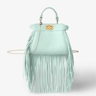 아이코닉 나노 피카부 백. 모든 디테일 재해석. 가죽 안감을 더한 내부, 견고한 파티션으로 분리된 내부 수납공간 2개, 스냅 버튼 2개가 달린 탈착식 핸들, 클래식 트위스트 락. 가느다란 체인 숄더 스트랩을 사용해 손에 들거나 크로스바디 스타일로 연출 가능. 라이트 그린 컬러 나파 가죽 소재. 패널을 따라 더한 톤온톤 프린지. 골드 피니시 메탈웨어.