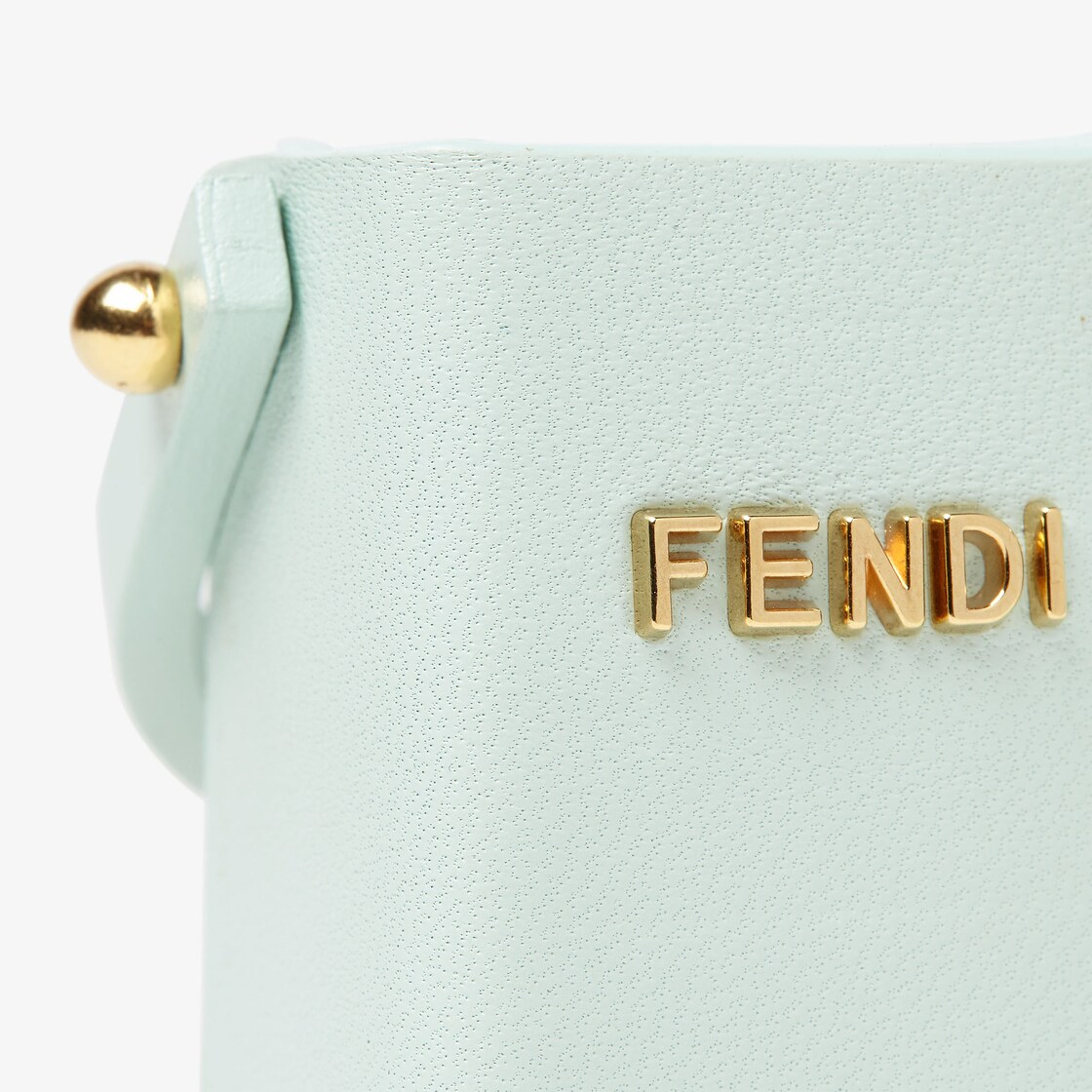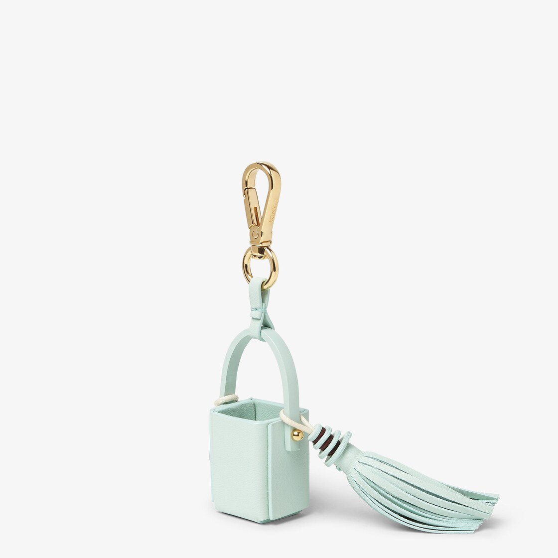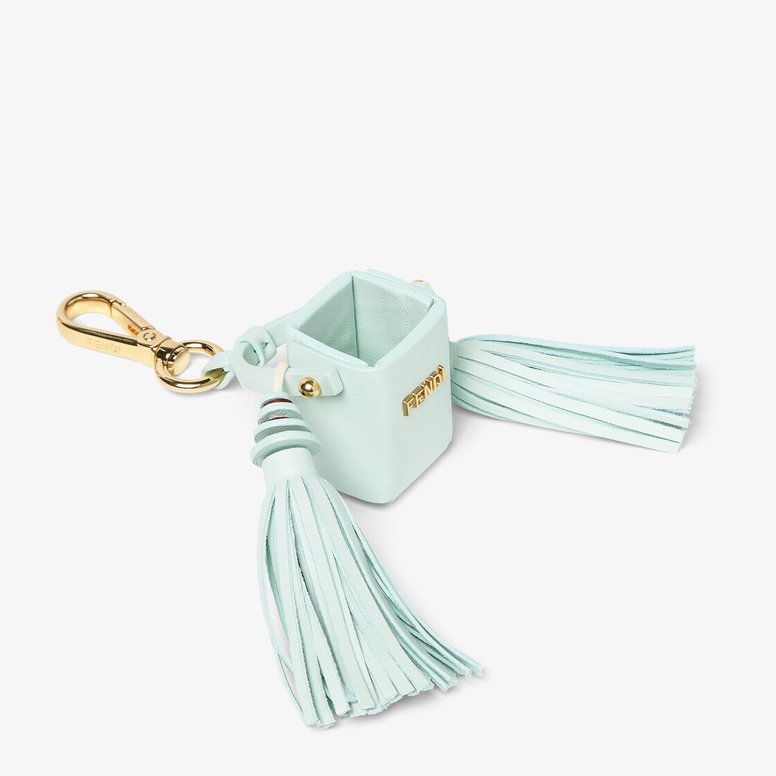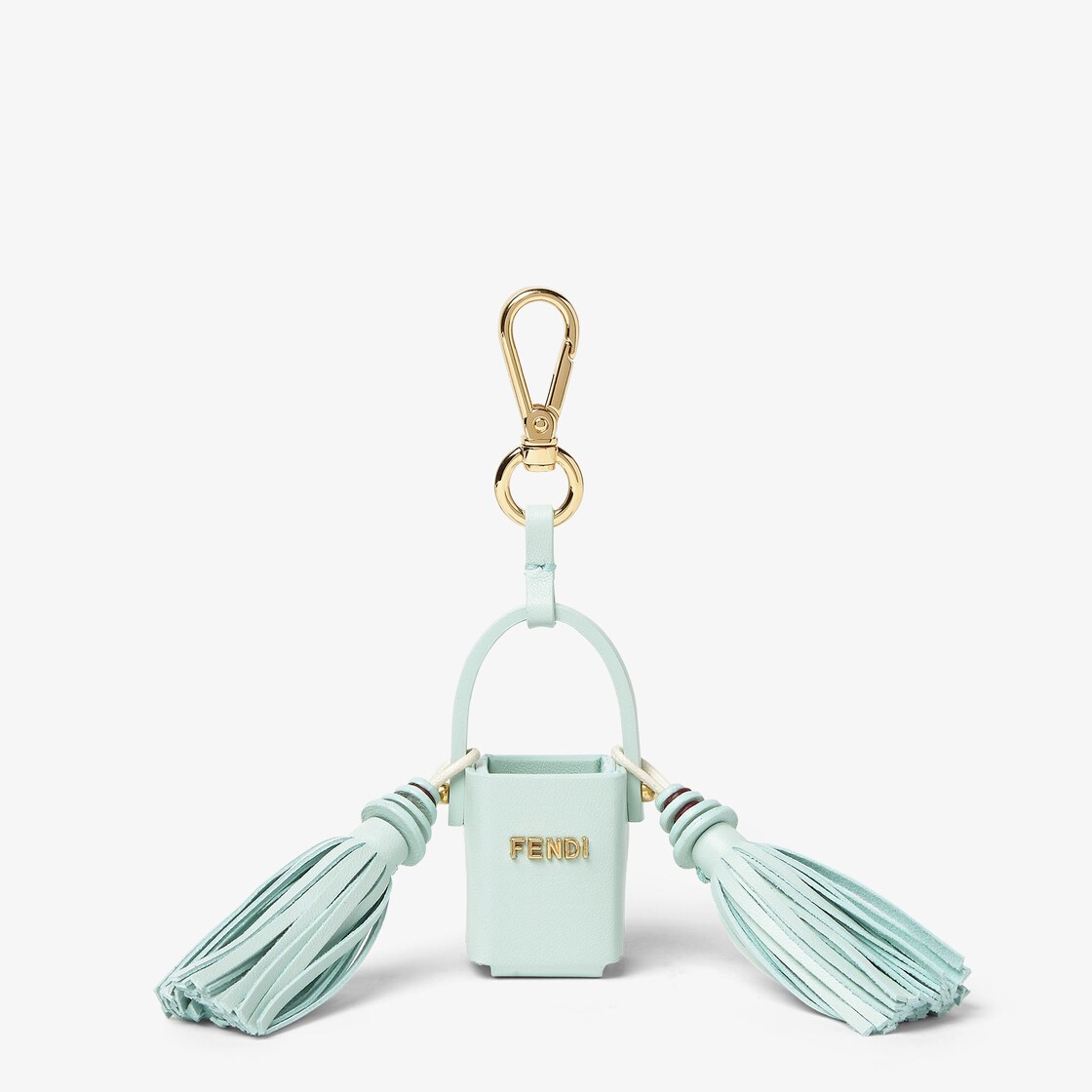 라이트 그린 컬러 가죽 소재 향수 홀더 참. 옆면의 매칭 오버사이즈 태슬 및 모렐로 체리 레드 컬러 지오메트릭 디테일 장식. 가죽 핸들 및 메탈 스냅 후크. 앞면에 메탈 펜디 레터링 장식. 골드 피니시 메탈웨어.