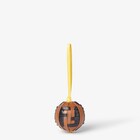 구 형태의 참. 브라운 컬러와 블랙 컬러 FF 모티프를 이루는 핸드 우븐 가죽 스트립 소재. 옐로우 컬러 가죽 스트랩을 이용해 백에 부착해 퍼스널라이징할 수 있습니다. 팔라듐 피니시 메탈웨어.