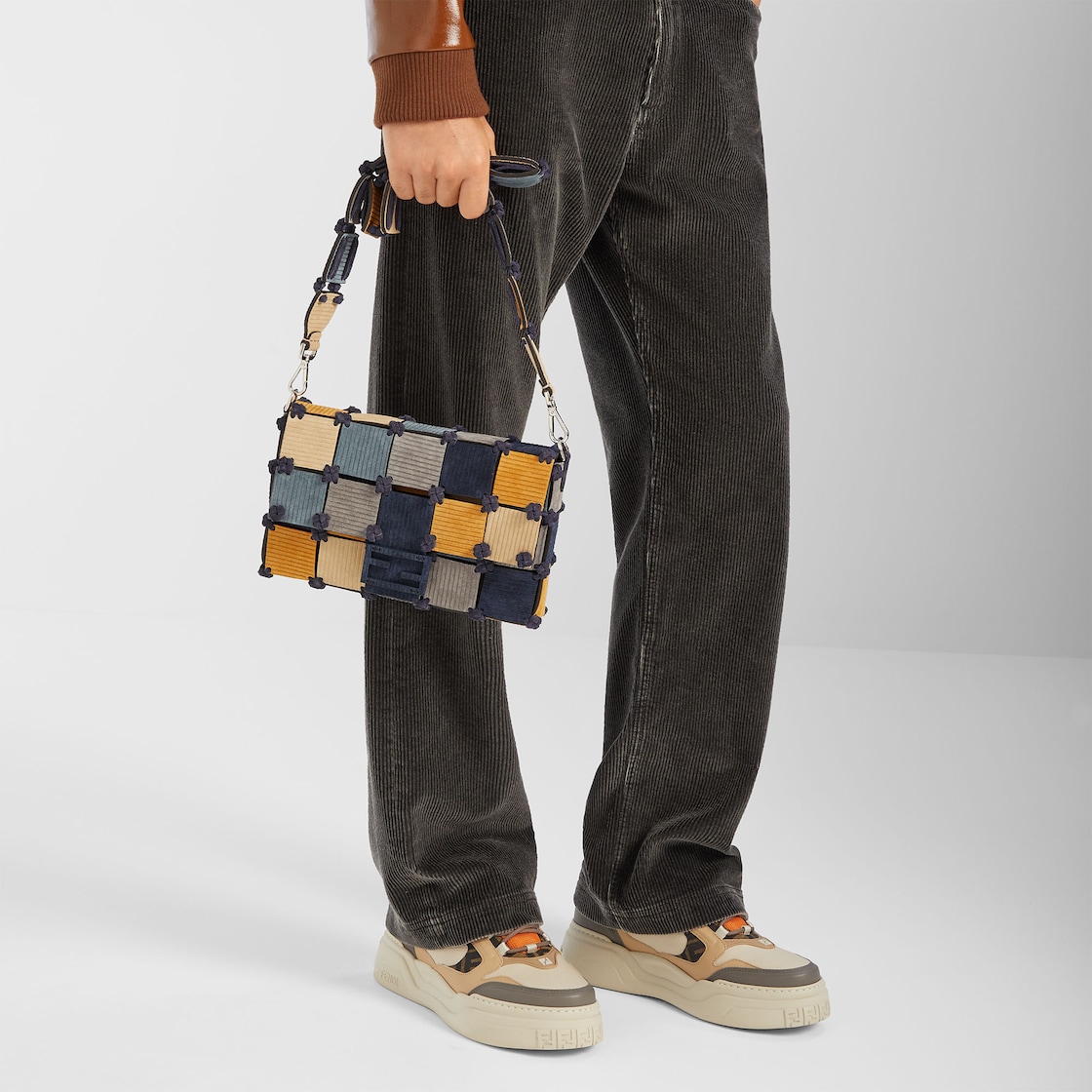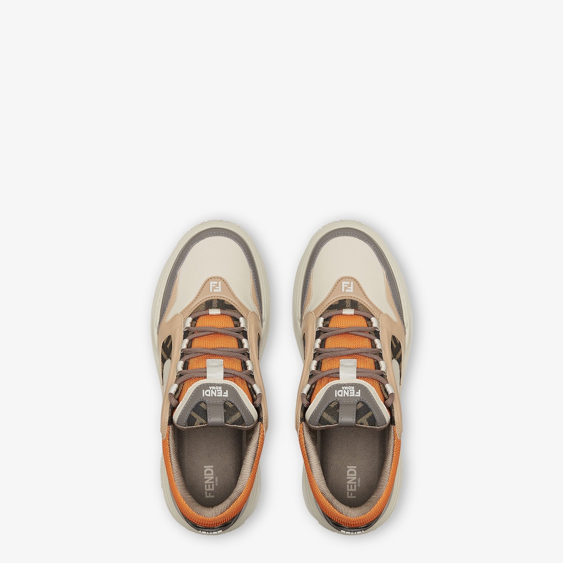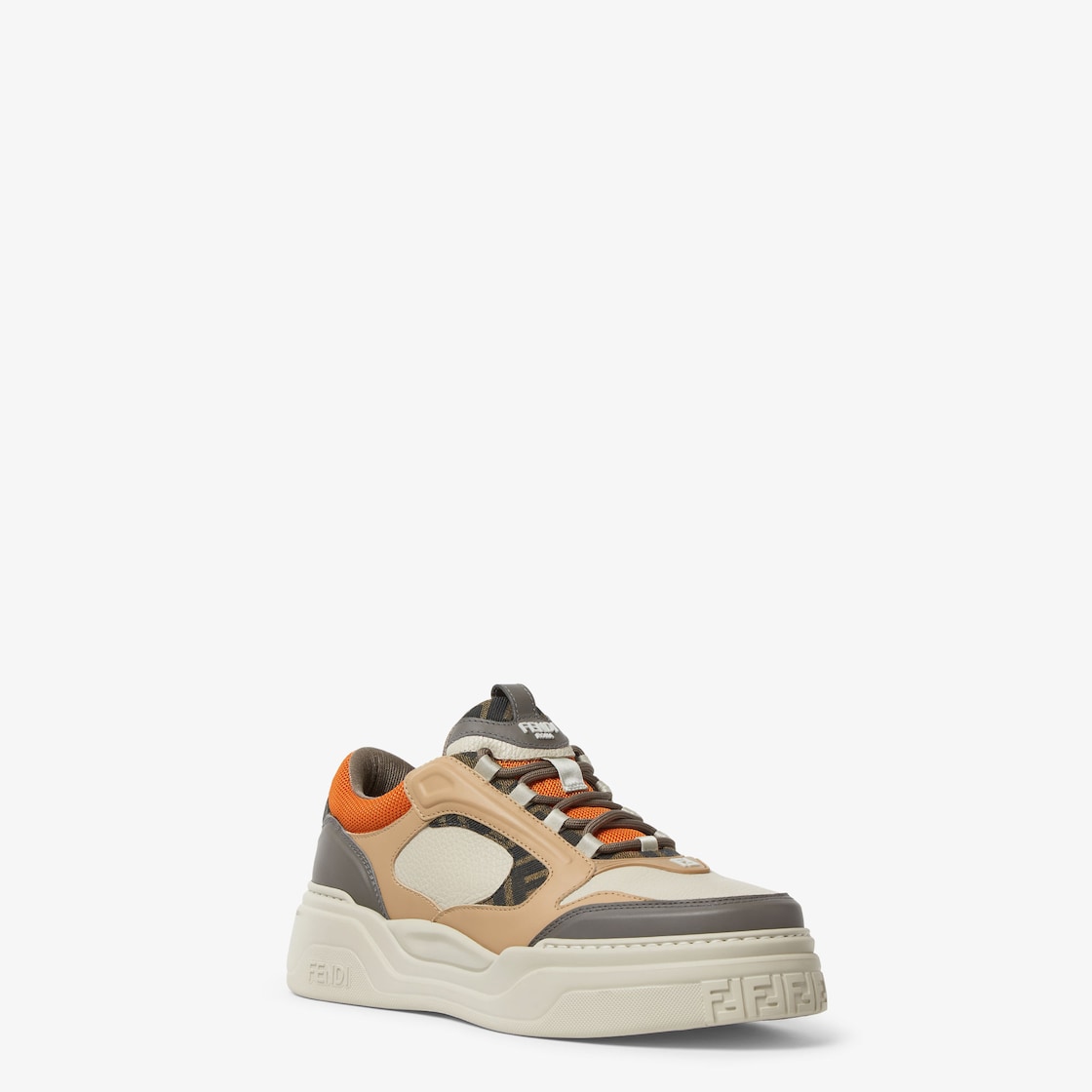 펜디 포스 레이스업 로우탑. 오프 화이트 컬러 풀 그레인 가죽 소재, 베이지 컬러 패딩 디테일. 브라운 컬러 FF 자카드, 매끄러운 그레이 컬러 가죽, 인젝션, 오렌지 컬러 테크니컬 패브릭 장식. 가벼운 화이트 컬러 러버 솔로 마무리. 토와 힐의 FF 모티프.