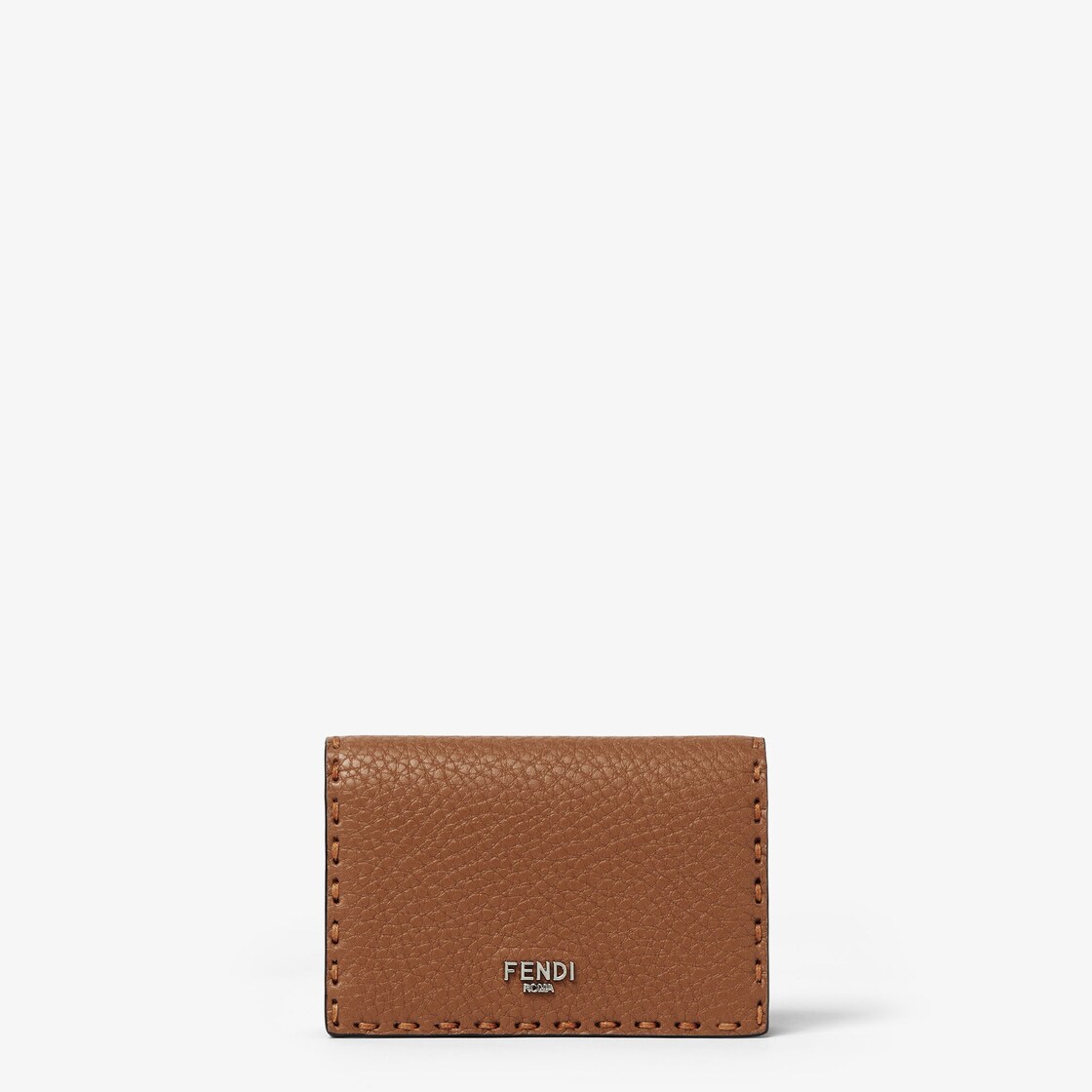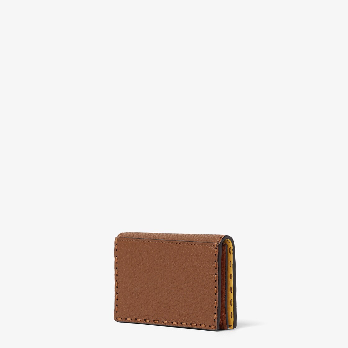 플랫 카드 케이스. 플랫 포켓 2개, 중앙 수납공간 및 후면의 플랫 포켓. 탠 컬러 로마노 가죽 소재. 1925년부터 대대로 펜디 장인들을 통해 전해 내려온 아이코닉 셀러리아 스티치를 보여주는 102개의 핸드 스티칭 매크로 탑스티치. 대조적인 선플라워 옐로우 컬러 가죽 안감. 팔라듐 피니시 메탈웨어.