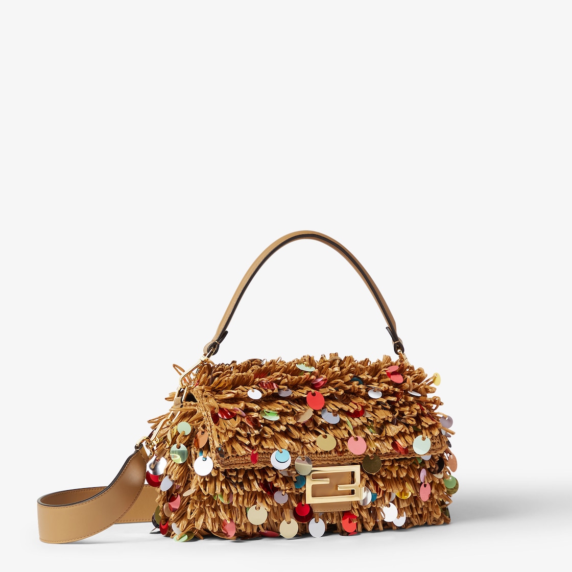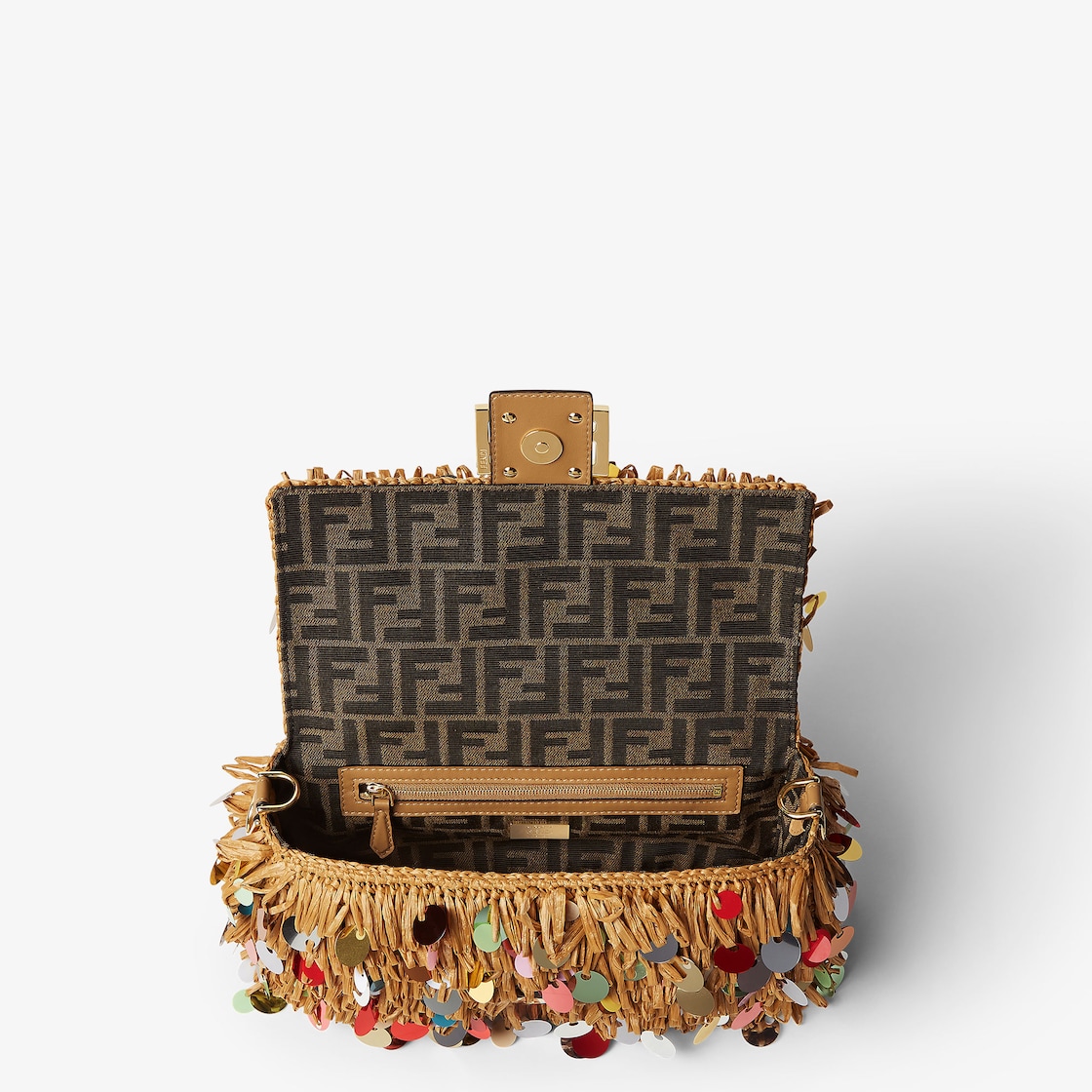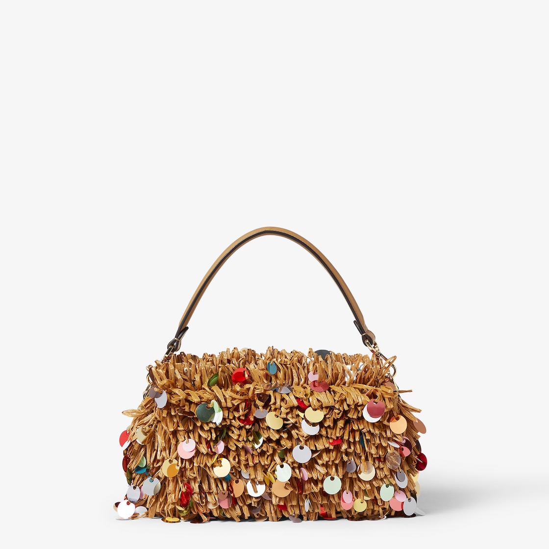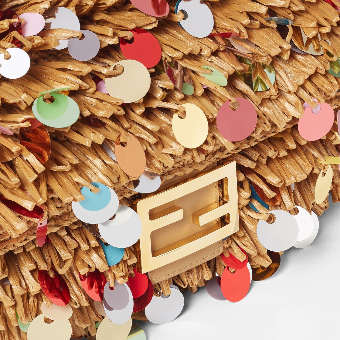 내추럴 컬러 핸드 우븐 라피아로 전체를 제작. 멀티 컬러 오버사이즈 시퀸 장식 프린지. 카푸치노 컬러 송아지 가죽 트리밍 및 FF 클래스프 장식.