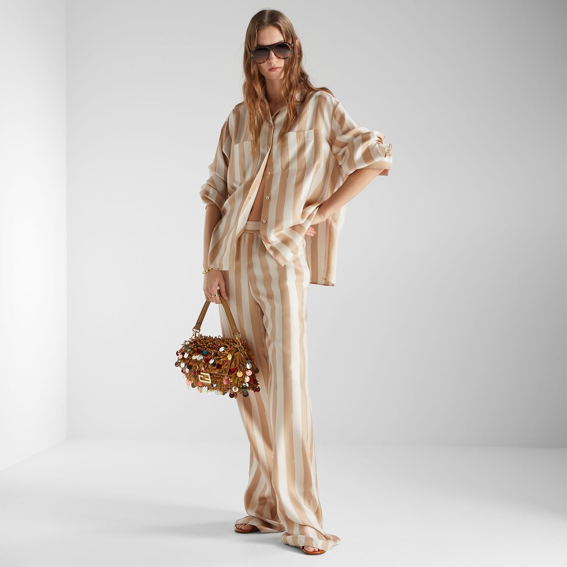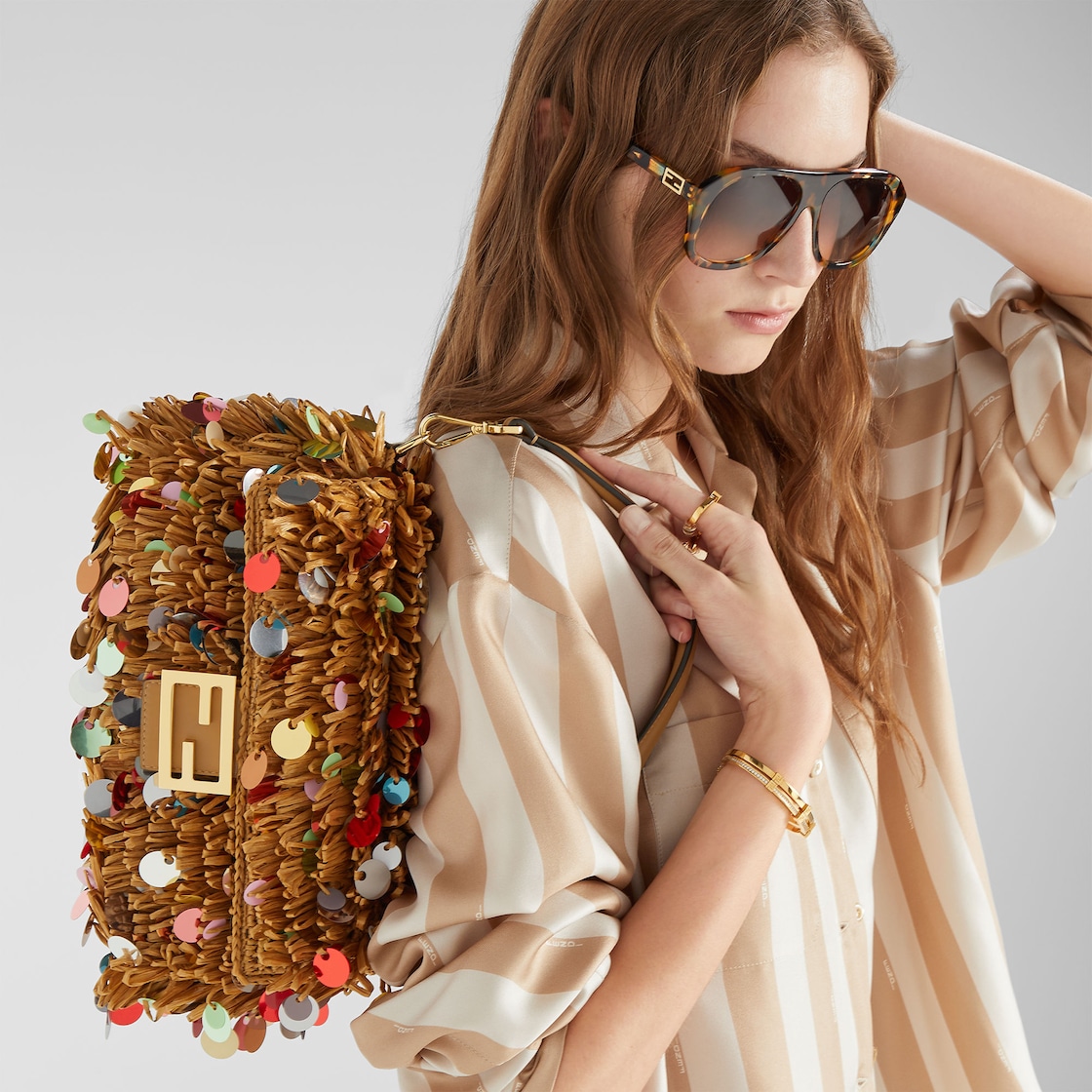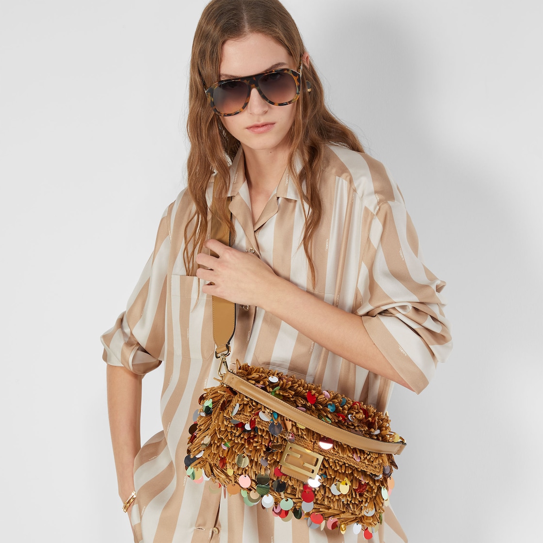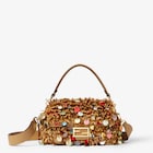 내추럴 컬러 핸드 우븐 라피아로 전체를 제작. 멀티 컬러 오버사이즈 시퀸 장식 프린지. 카푸치노 컬러 송아지 가죽 트리밍 및 FF 클래스프 장식.