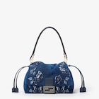 플록 텍스처의 블루 컬러 데님 소재. 털실, 비즈, 시퀸 소재 버터플라이 자수 장식. FF 클래스프, 다크 블루 컬러 가죽 인서트 장식.