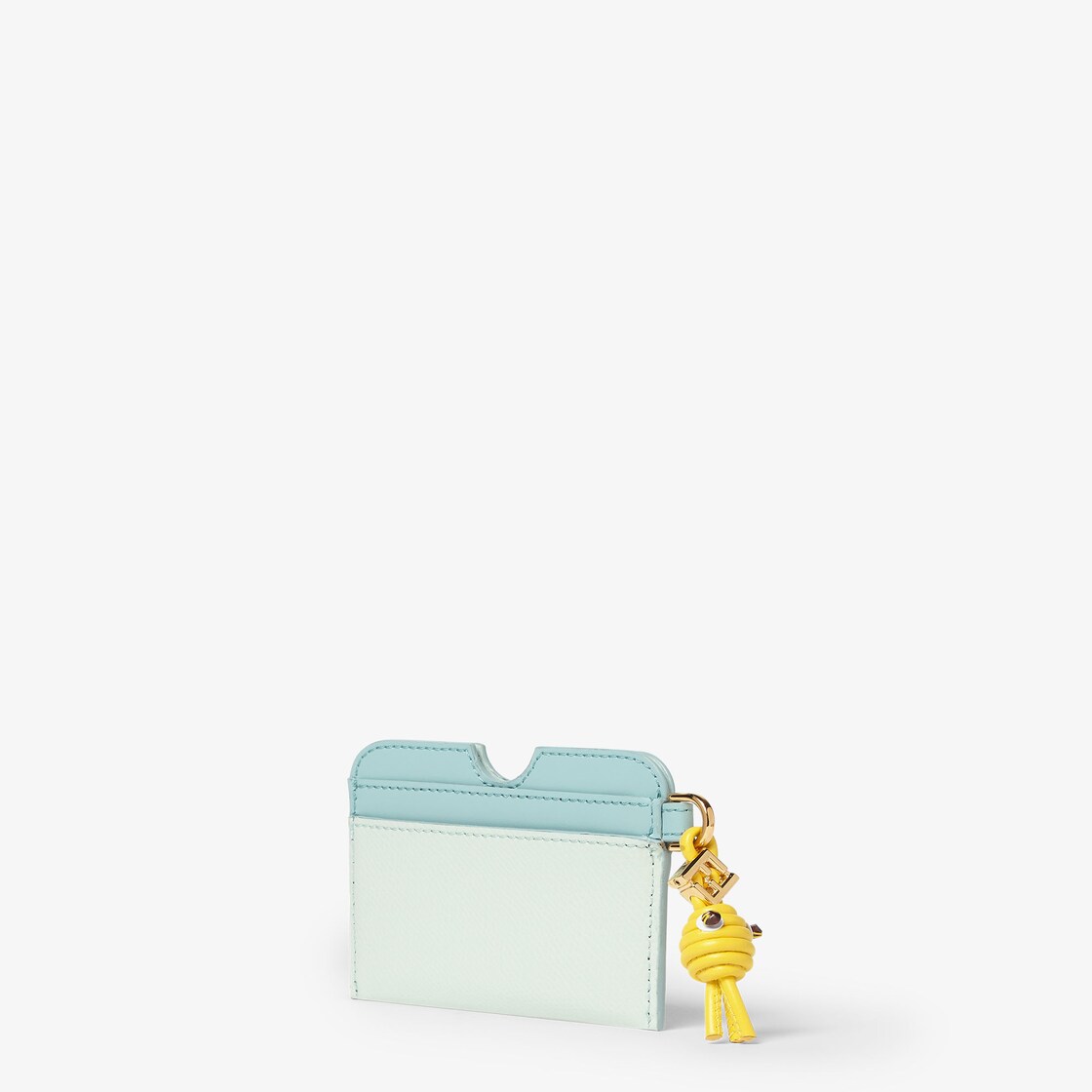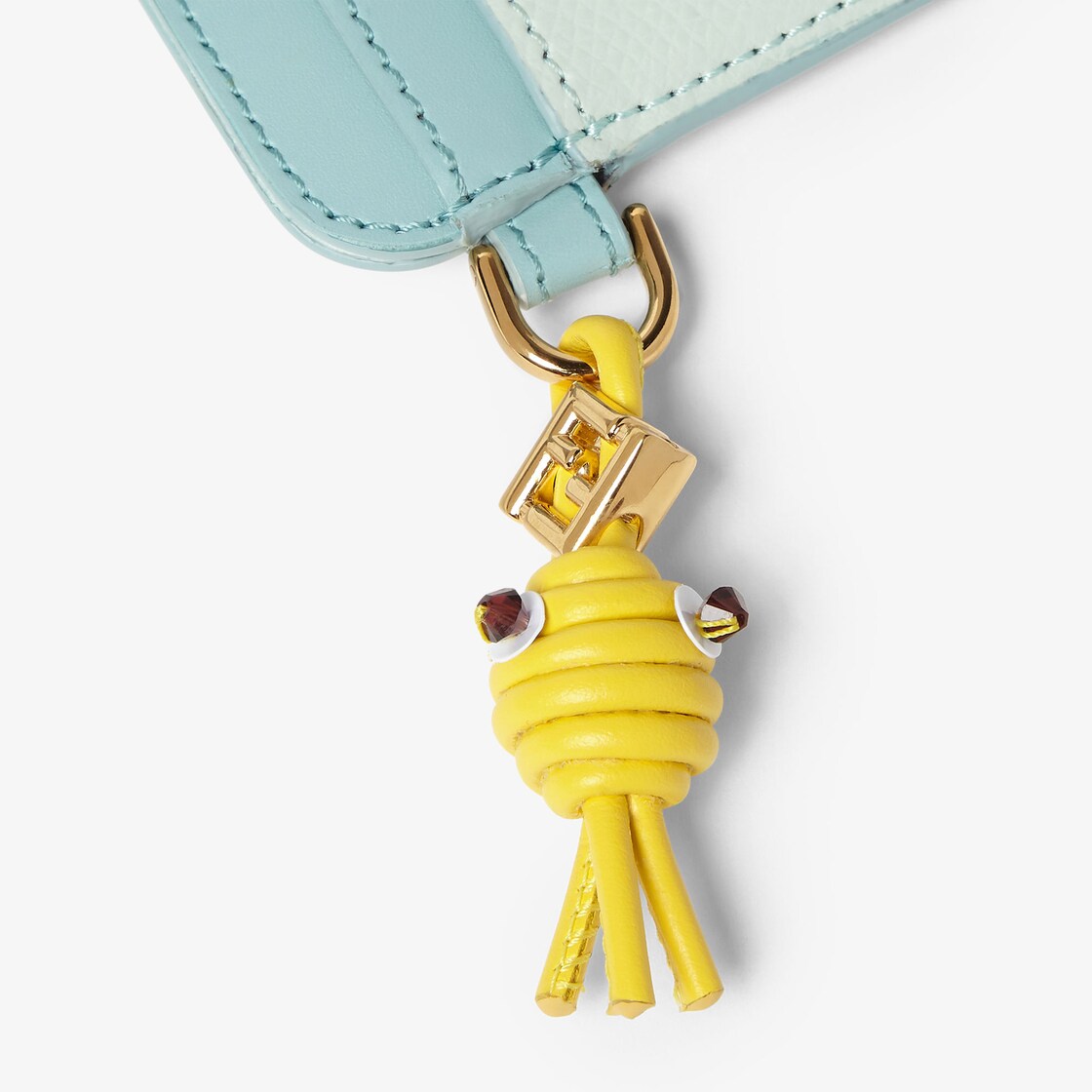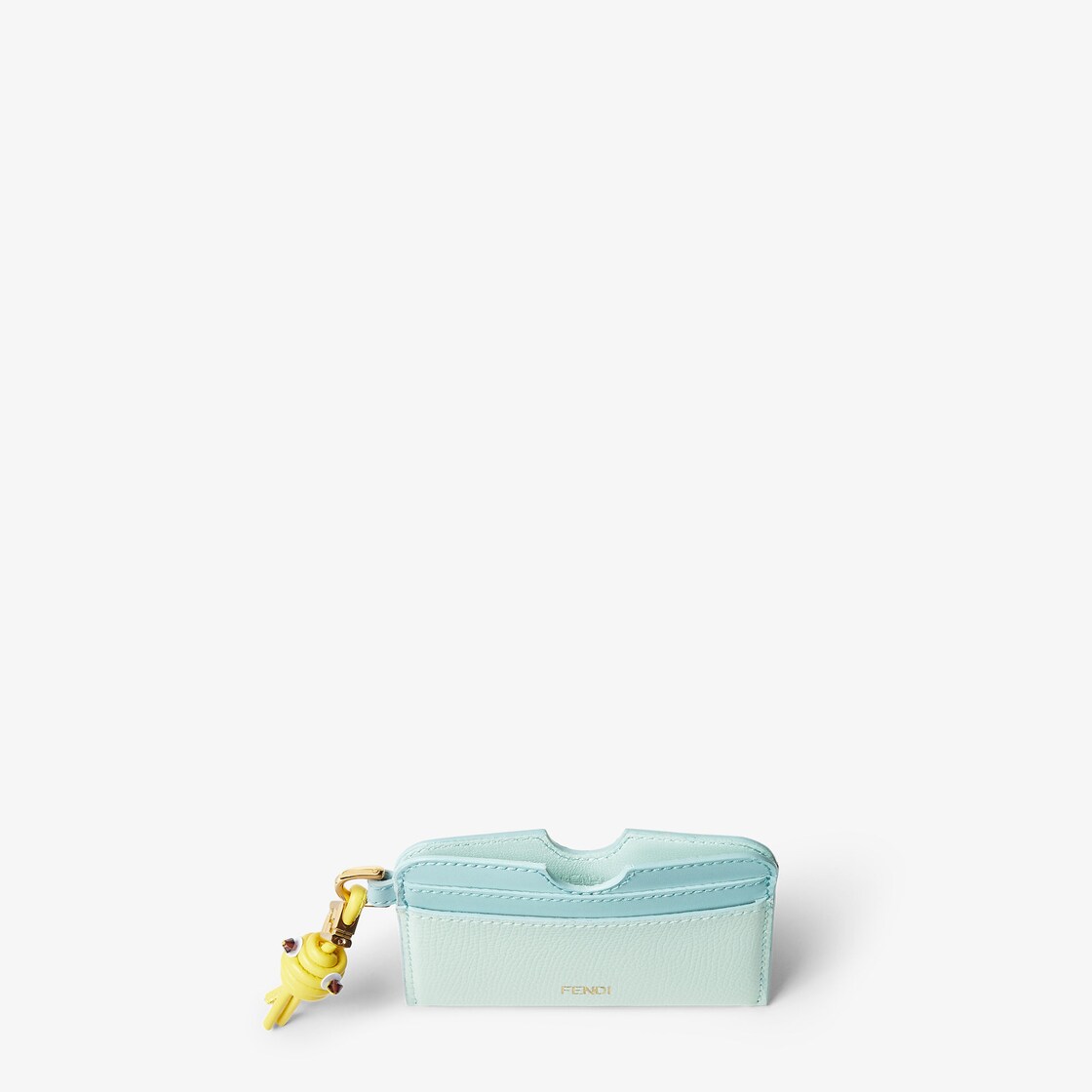 FF 다이아몬드 카드 케이스.중앙 수납공간과 카드 슬롯 4개. 아쿠아 그린 및 라이트 그린 컬러의 매끄러운 가죽과 풀 그레인 송아지 가죽 소재. 옐로우 컬러 튜브형 가죽 소재 피쉬 참. 눈에는 비즈가 사용되고 FF 다이아몬드 장식이 더해졌습니다. 골드 피니시 메탈웨어.