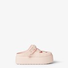 라운드 토와 플랫폼 솔이 있는 사보. 핑크 컬러의 페이턴트 나파 가죽 소재. 톤온톤 FF 바게트 액세서리 장식을 더한 밴드. 발등이나 발뒤꿈치에 착용할 수 있는 디자인. 매우 가볍고 청키한 톤온톤 러버 솔, 힐의 펜디 레터링.
