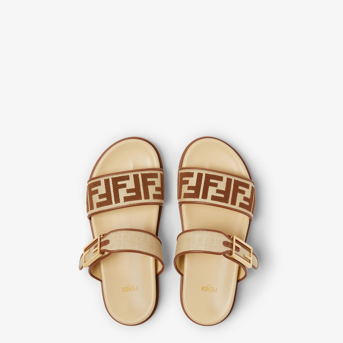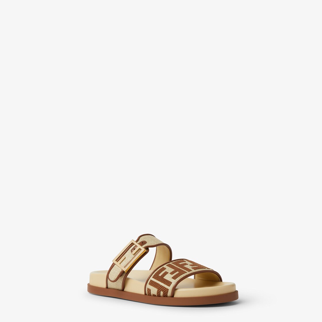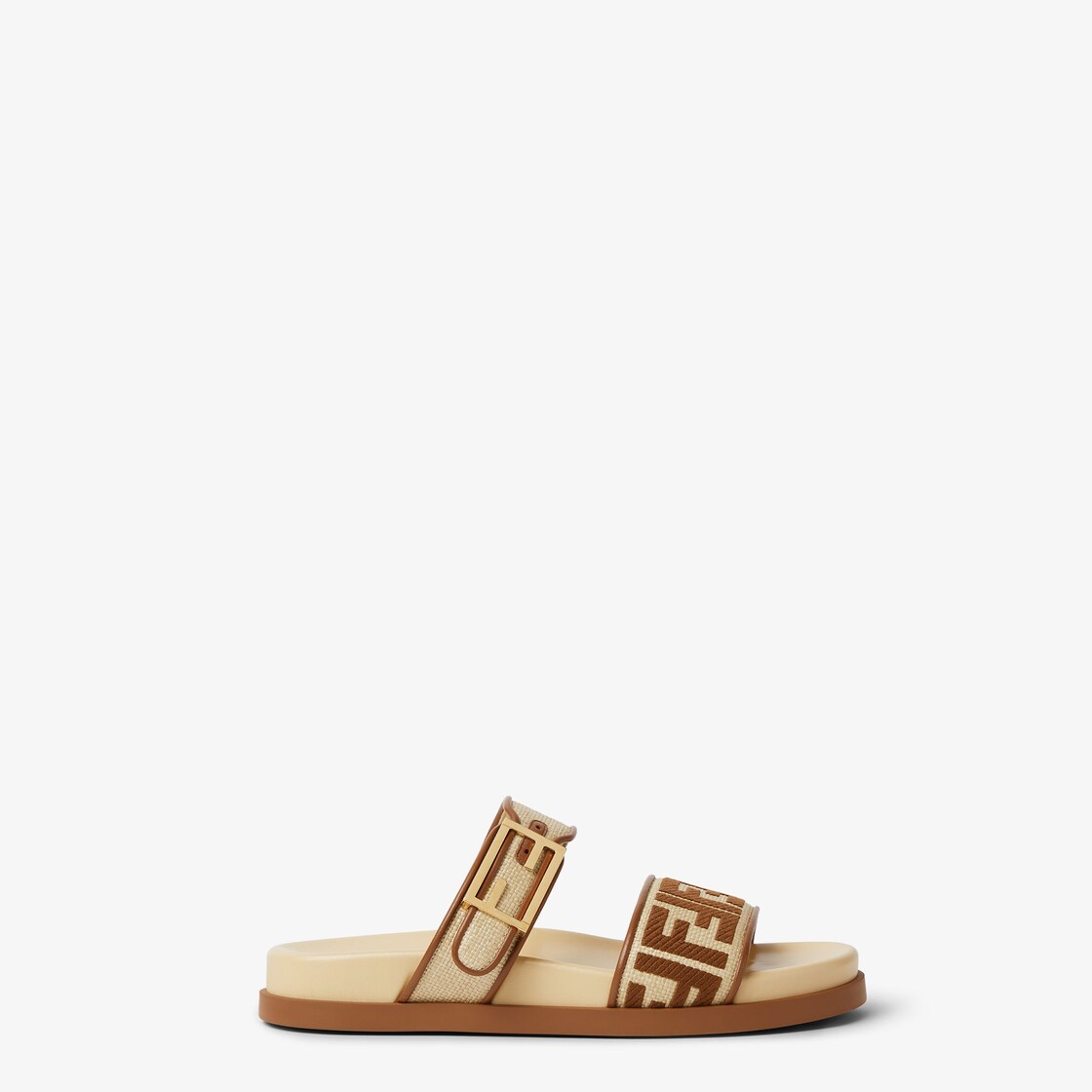 FF 바게트 장식 버클 디테일의 더블 밴드 플랫 슬라이드. 베이지 컬러 라피아 소재, 브라운 컬러 나파 가죽 트리밍. 브라운 컬러 털실 소재 FF 자수 장식. 골드 피니시 메탈웨어. 브라운 컬러 러버 솔.