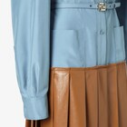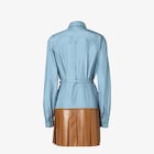 쇼트 셔츠 드레스. 셔츠 칼라와 롱 슬리브. 가슴 포켓. 웨이스트라인 솔기 및 플리츠 스커트. 눈에 보이는 앞면 버튼 잠금. 라이트 블루 컬러 실크 포플린 소재, 더블 레이어 효과의 브라운 컬러 나파 가죽.