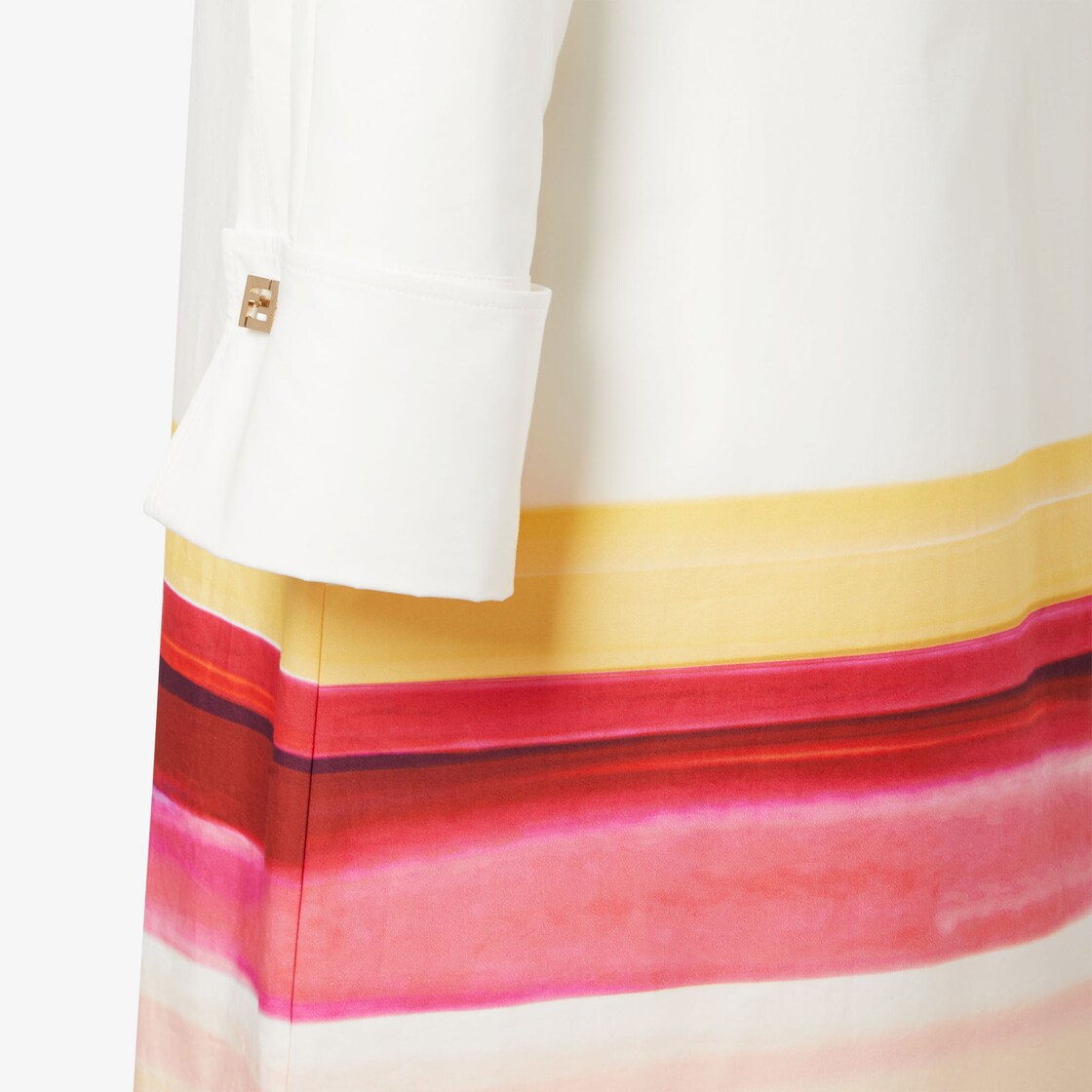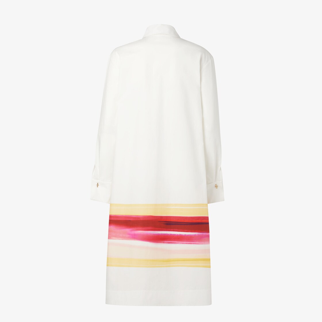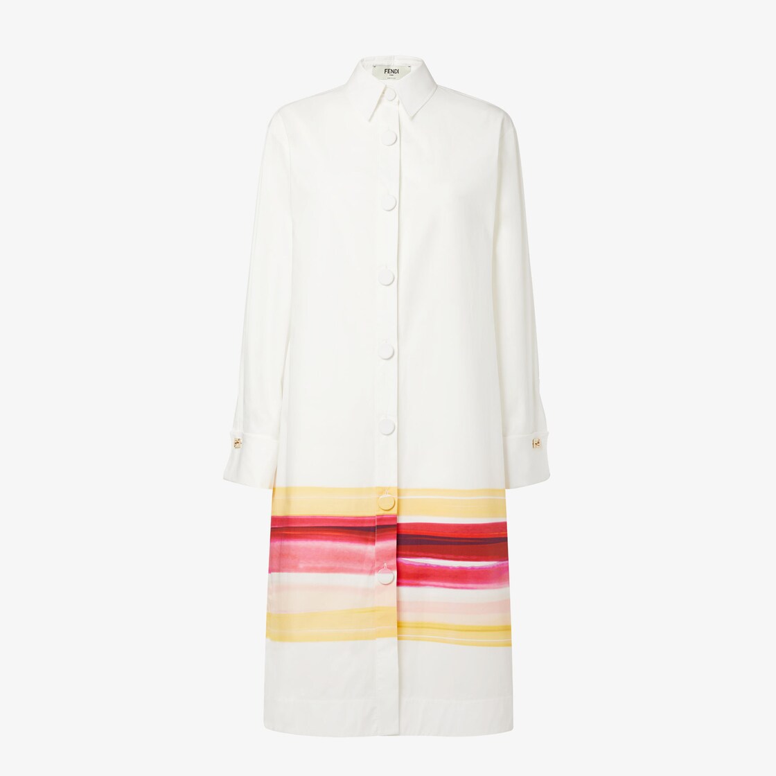 셔츠 드레스. 셔츠 칼라와 롱 슬리브. 매치되는 라지 커버드 버튼으로 여밈. 화이트 코튼 포플린 소재. 밑단에 라즈베리 레드와 옐로우 컬러 베네치아 스트라이프 모티프 프린트 장식. 와이드 커프와 커버드 버튼.