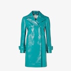 스트레이트 컷 미디 트렌치 코트. 라펠 칼라와 7부 소매, 커프 스트랩. 웰트 사이드 포켓. 컨실드 스냅 버튼식 잠금. 글로시 피니싱의 부드러운 터쿼이즈 컬러 가죽 소재. 안감 처리. 엠보싱 FF 로고를 더한 웨이스트 뒷면의 마르탱갈 장식.