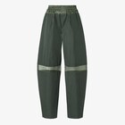 신축성 있는 웨이스트의 배기 팬츠. 올리브 그린 컬러 테크니컬 개버딘 소재. 웨이스트와 무릎 부분에 같은 컬러의 세미 시어 패브릭 인서트 피니시.