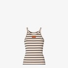 슬림핏 슬리브리스 탑. 브라운, 옐로우, 블루 스트라이프 모티프의 리브 니트 코튼 소재. 가슴 중앙에 더한 탠 가죽 펜디 패치 장식.