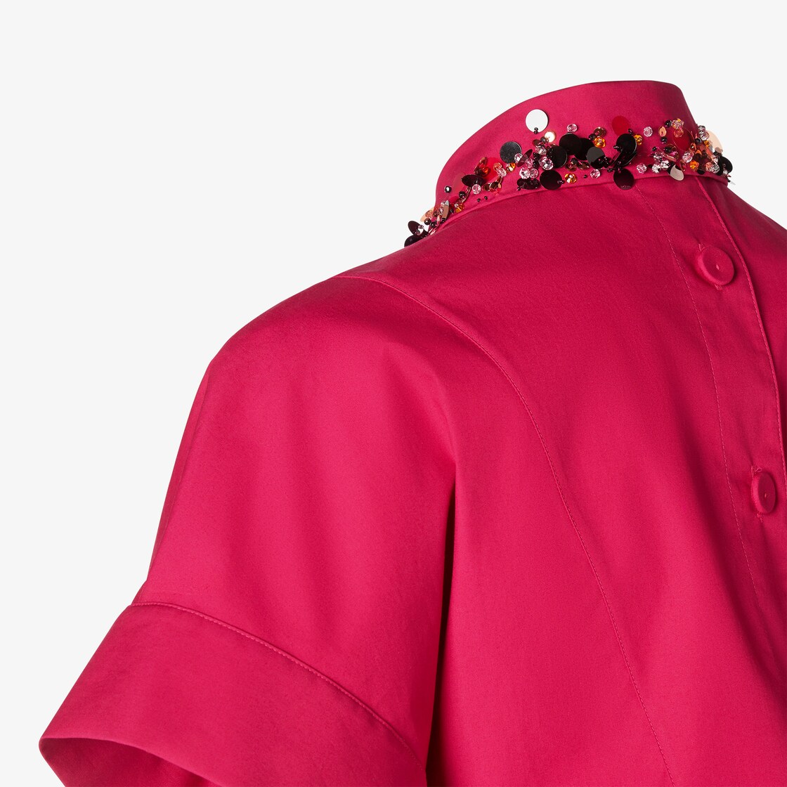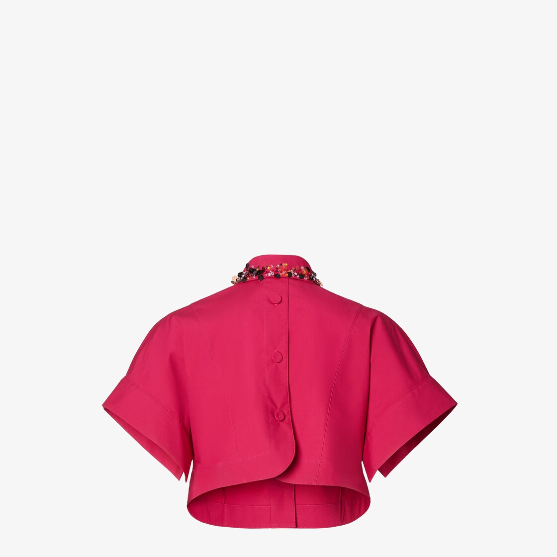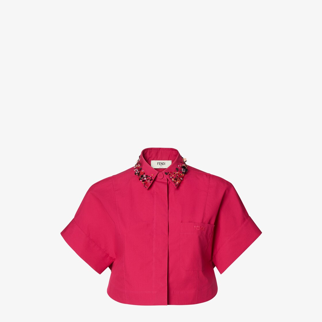 크롭 셔츠. 쇼트 코쿤 슬리브 및 왼쪽 가슴의 패치 포켓. 뒷면이 살짝 더 짧은 라운드 밑단. 컨실드 버튼 프론트 잠금장치. 라즈베리 레드 컬러 코튼 포플린 소재. 대조적인 시퀸과 라인스톤을 믹스한 자수 디테일의 칼라. 뒷면에 원단으로 감싼 버튼 모티프 및 가슴 포켓의 매칭 펜디 로고 자수 장식.