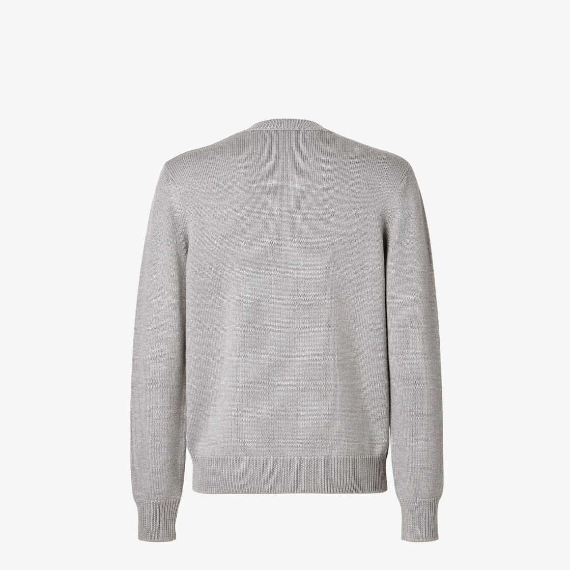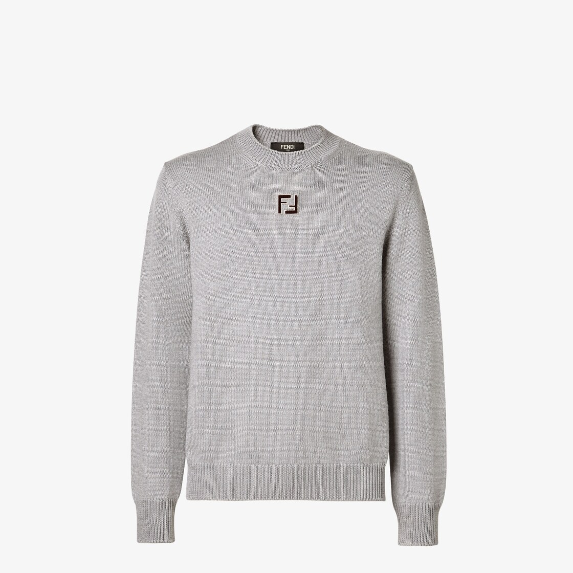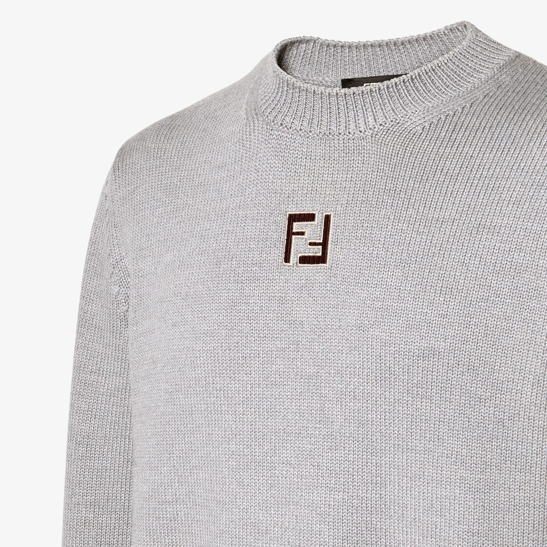 레귤러 핏 크루넥 스웨터. 그레이 컬러 울 털실 소재. 앞면에 버건디 컬러 코듀로이 마이크로 FF 디테일 맞춤형 디자인.