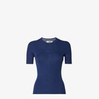 크루넥과 숏 슬리브 디자인의 슬림한 스웨터. 화이트 컬러 코튼 털실 소재. 심리스 리브 니트. 앞면에 레이스 효과 마이크로 퍼포레이션 펜디 스탬프 1925 모티프 장식.