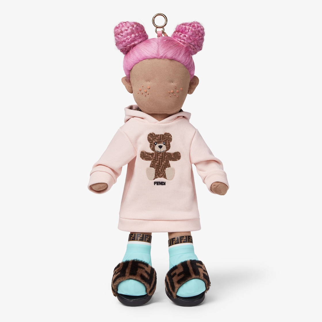 키다시아 브레이드 헤어의 알칸타라 (Alcantara) 소재 멜로디 맥시 참. 테디 자수 저지 플리스 드레스. 가죽 디테일 라이크라 (Lycra) 삭스. 가죽 솔 FF 프린트 시어링 슬리퍼. 뒷면에 후크가 부착된 가죽 루프.