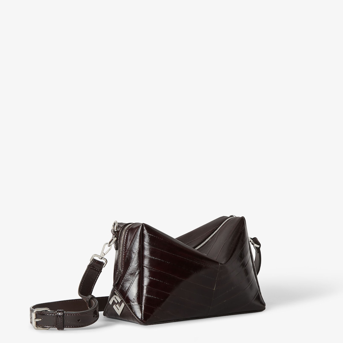 미디엄 펜디 루이 백. 부드러운 디자인, 샤이니 피니시의 고급스러운 다크 브라운 해그피쉬 가죽 소재, 셰브론 모티프를 이루는 인레이. 가죽 본연의 특징을 가지고 있어 각 백은 유일무이한 아이템으로 완성됩니다. 더블 슬라이더를 더한 긴 지퍼 잠금 및 코너에 FF 메탈 아플리케 장식.