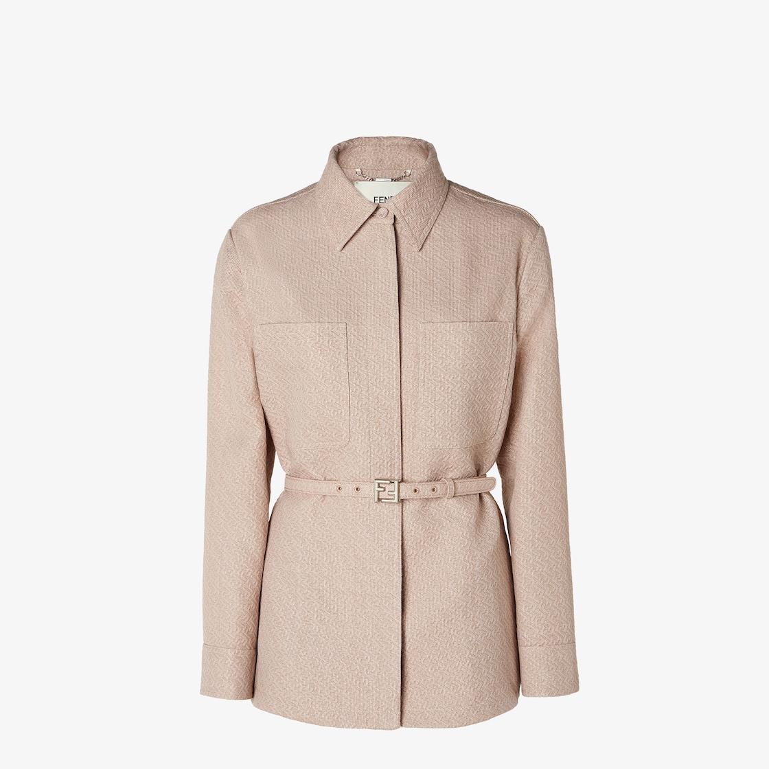 싱글브레스트 고 투 재킷. 셔츠 칼라와 로우컷 셋인 슬리브. 동일한 색상의 벨트. 메탈 FF 버클. 가슴 부분에 오버사이즈 패치 포켓. 컨실드 버튼 여밈. 라이트 브라운 톤의 입체적인 마이크로 FF 모티프를 더한 울 자카드 소재.