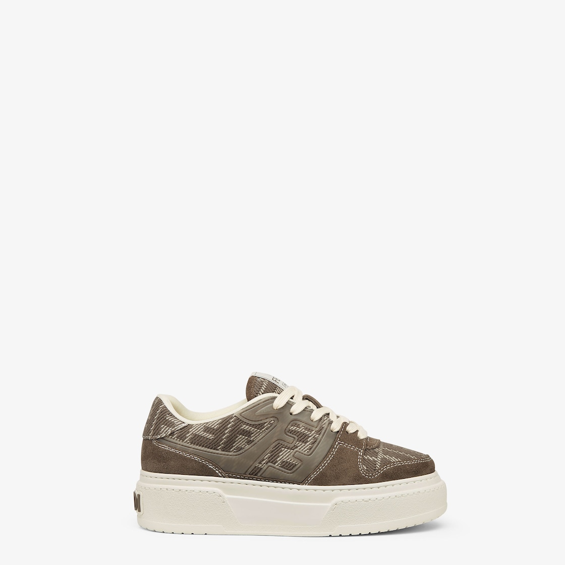 펜디 매치 레이스업 스니커즈. 브라운 데님 효과 FF 자카드 소재, 매칭 스웨이드 디테일. 측면에 사출성형 방식의 FF 아플리케. 크림 컬러의 플랫 레이스. 50mm 플랫폼 러버 솔, 뒷면의 오버사이즈 엠보싱 펜디 레터링.