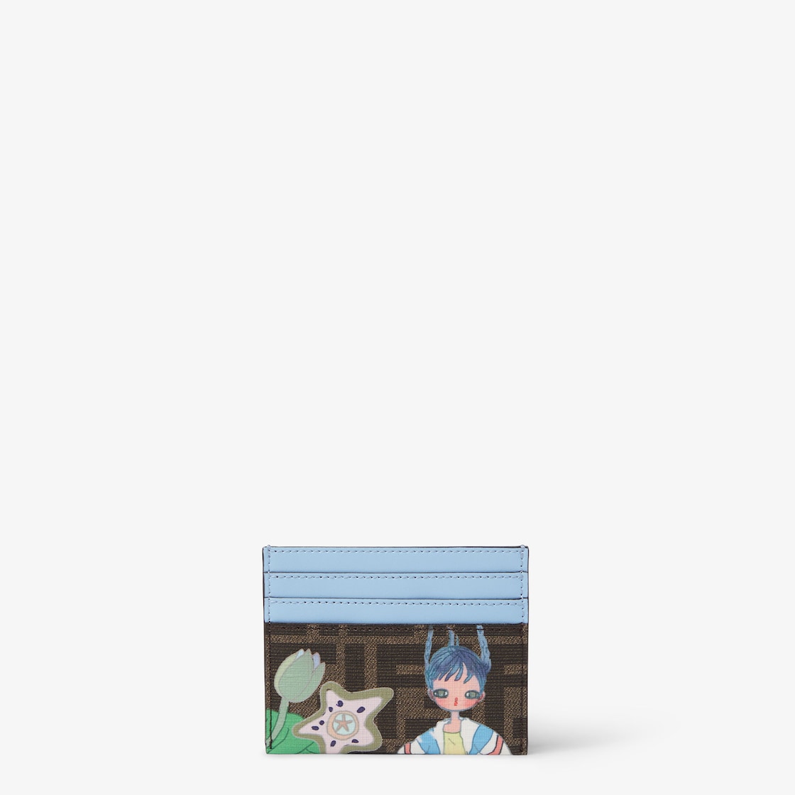 حاملة بطاقات Fendi Roma مع قسم مركزي وست فتحات للبطاقات.التصميم جزء من المجموعة الموسمية "Fantastic Fendi Future" المصمّمة بالتعاون مع الفنانة اليابانية آيا تاكانو، وهو مصنوع من قماش FF باللون البني التبغي مع طبعة Fantastic Future Girls متعددة الألوان.تفاصيل من جلد العجل باللون الأزرق الفاتح.