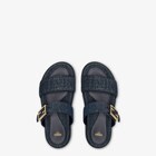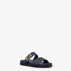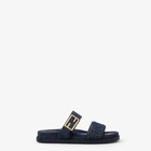 صندل Slide بشريط مزدوج مع مشبك مزيّن بعلامة FF Baguette.مصنوع من الدنيم باللون الأزرق الداكن ومطرّز بعلامة FF من نسيج بدرجات مختلفة من اللون نفسه.داخلية الحذاء والتفاصيل من الجلد بدرجات مختلفة من اللون نفسه.زينة معدنية باللون الذهبي.