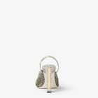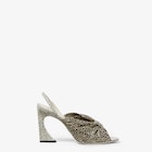 حذاء بشريط مطاطي خلفي، ومقدّمة لوزية الشكل، ورباط مطاطي ناعم، وشريط مزدوج يلتف على شكل ربطة فراشة.مصنوع من جلد العجل المطبوع بعلامة Peppered Falena باللونين الأسود والأبيض.كعب عالٍ منحوت ومكسو بدرجات مختلفة من اللون نفسه، مع شريط معدني باللون الذهبي محفور بعلامة Fendi.