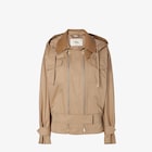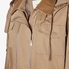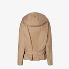 بلوزون يُغلق بسحّابين طويلين متوازيين من المعدن مع حزام نصفي في الجهة الأمامية من الخصر.رقبة قميص، وقلنسوة برباط قابلة للفصل، وأكمام منخفضة عند الكتف مع أشرطة على أطراف الأكمام.جيبان خارجيان مع زرّ على الجهة الأمامية وجيبان جانبيان.مصنوع من دريل القطن باللون البيج.رقبة من القطن بدرجات مختلفة من اللون نفسه وحزام نصفي، وجهة داخلية للرقبة من الجلد مع علامة Fendi مطرزة على الجيب الأيمن.زينة معدنية بلمسة نهائية من البلاديوم (palladium).