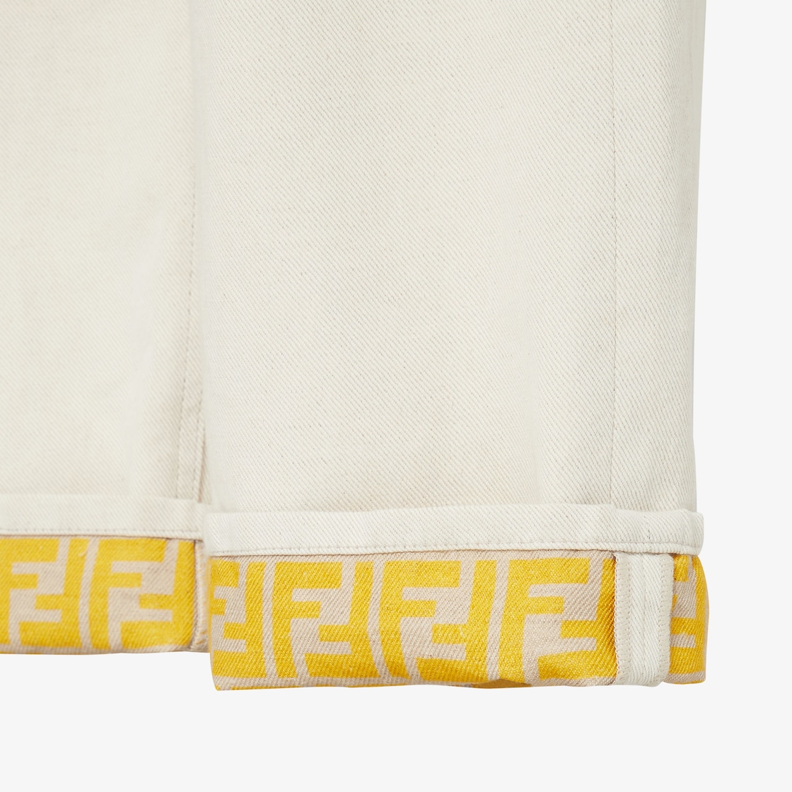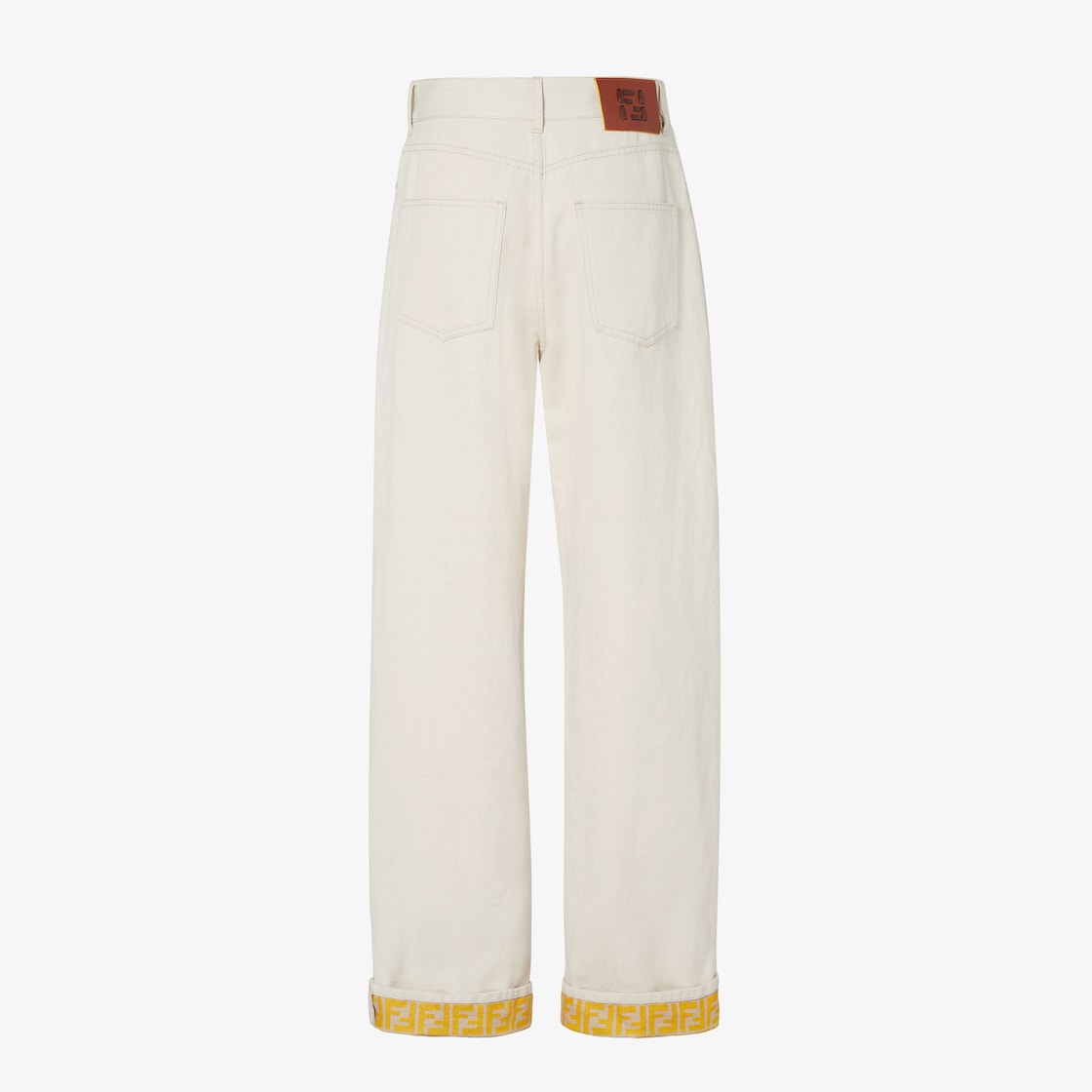 سروال بخصر عالٍ وخمسة جيوب وساق واسعة بقصّة مستقيمة.إغلاق بزر كبس وسحاب مخفي.مصنوع من الدنيم باللون البيج.بطانة مع علامة FF باللون الأصفر وحزام خلفي من الجلد باللون البني مع تفاصيل Selleria FF.درزات بلون متباين ومسامير معدنية بلمسة نهاية من البلاديوم (palladium).