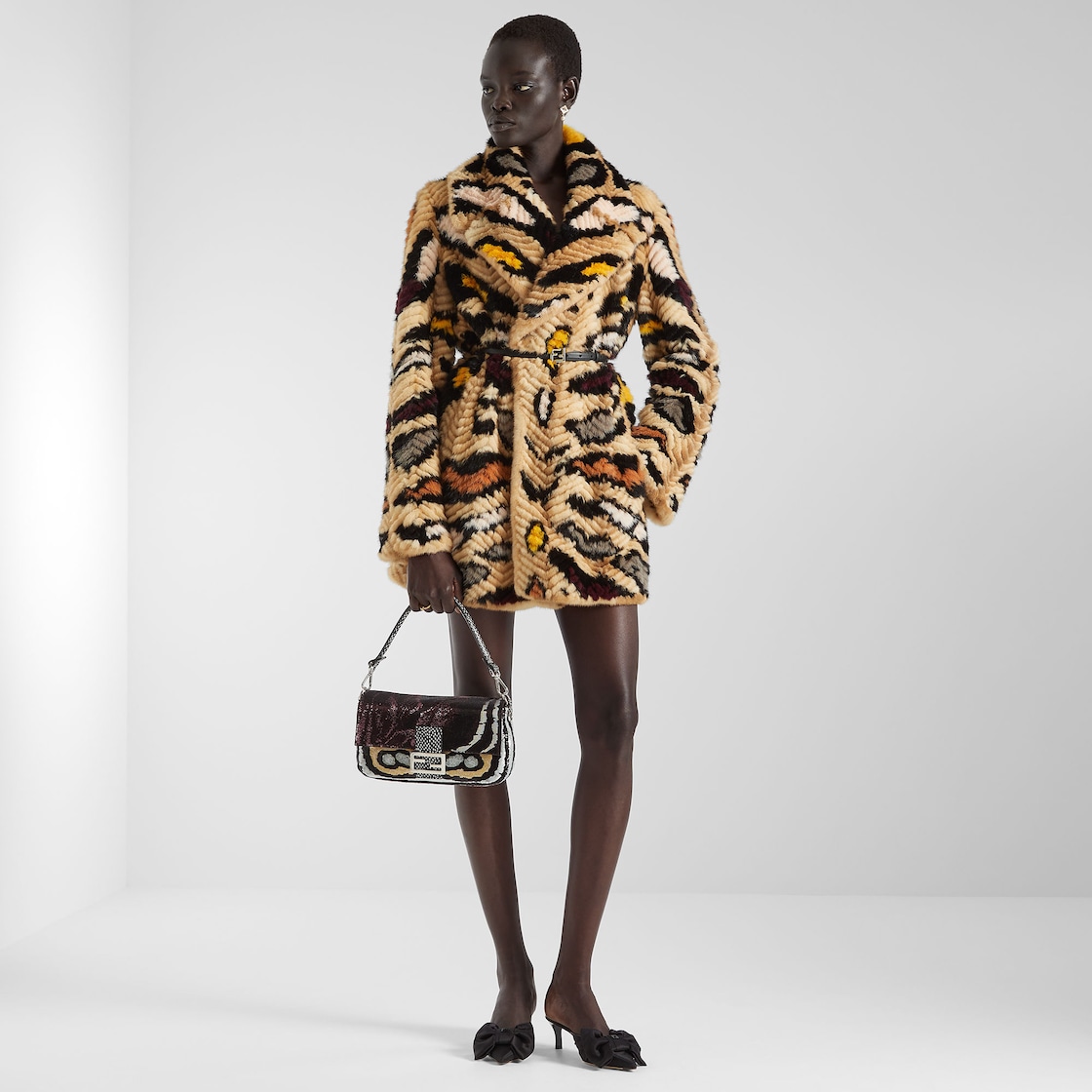 معطف متوسط الطول مع رقبة بطيّة وأكمام طويلة وجيوب جانبية.حزام من الجلد بلون متناسق مع مشبك FF معدني.يتميز بعلامة فراشة بمزيج من الألوان المتباينة.ملمس الريش المميز يجعل المعطف في منتهى الخفة.