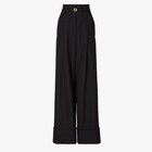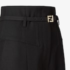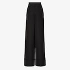 سروال بخصر عالٍ مع شريط علوي وطيّات في الجهة الأمامية.جيوب جانبية وأطراف عريضة مثنية.حلقات حزام بلون متناسق مع حزام بمشبك FF من المعدن على الخصر.إغلاق بسحاب مخفي.مصنوع من الصوف جران دو بودر (grain de poudre) باللون الأسود.زينة معدنية بلمسة نهائية من البلاديوم (palladium).