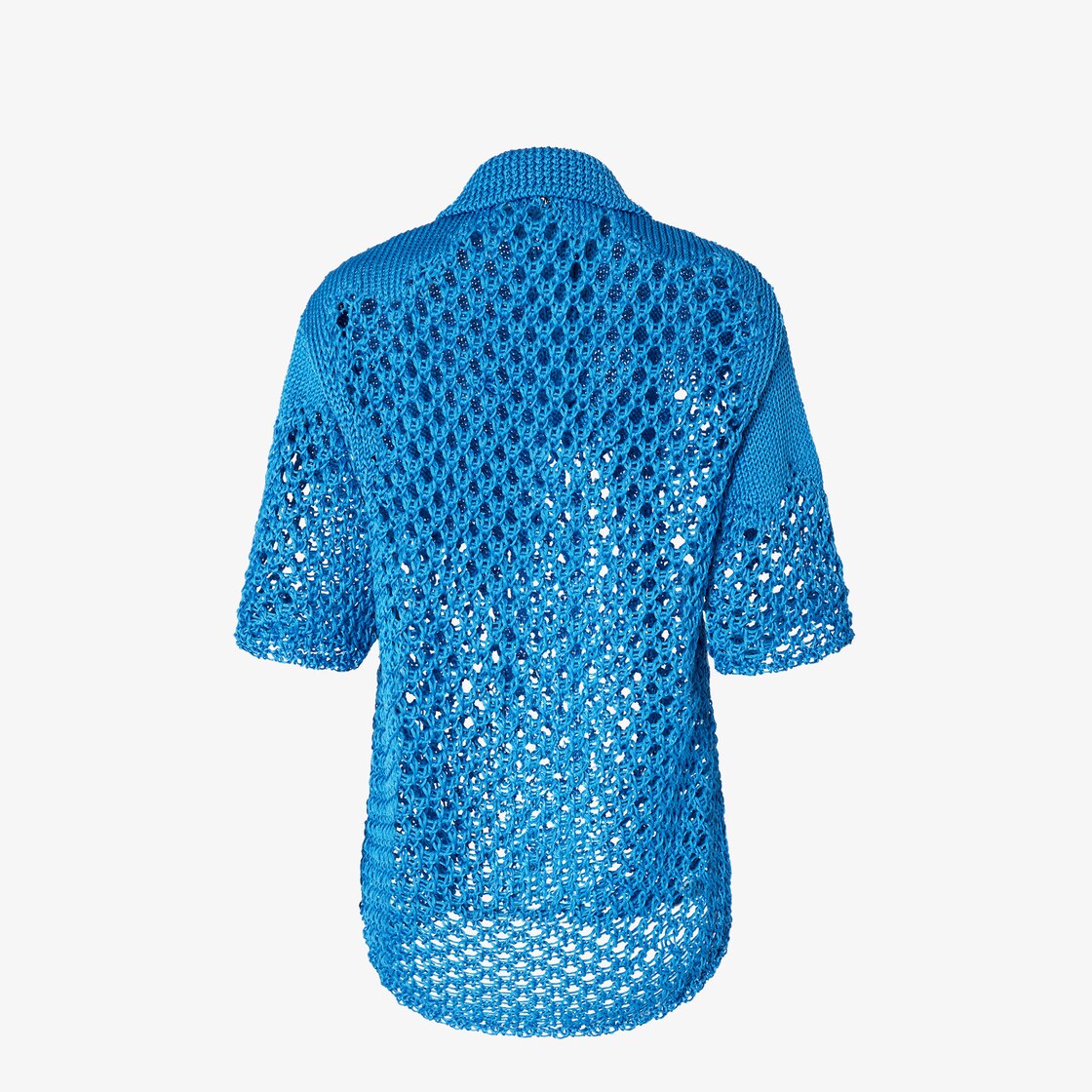كنزة بولو بأكمام قصيرة.رقبة كلاسيكية مع أزرار إغلاق بلون متناسق.مصنوعة من نسيج الحرير باللون الأزرق الفاتح، مع حبكة macramé سميكة بقصّة مبتكرة وتأثير شفاف على الجزء السفلي والظهر.
