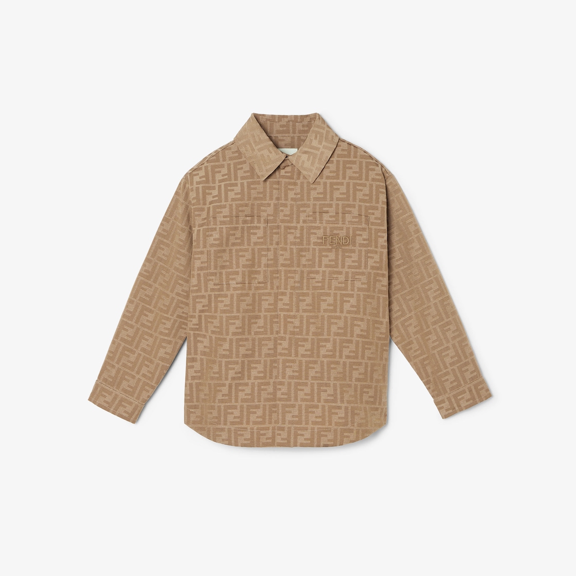 جاكيت Go To للأطفال من الكانفاس مع شعار FF باللون البيج بدرجات مختلفة من اللون نفسه وعلامة Fendi مطرزة على الجيب في الجهة الأمامية.