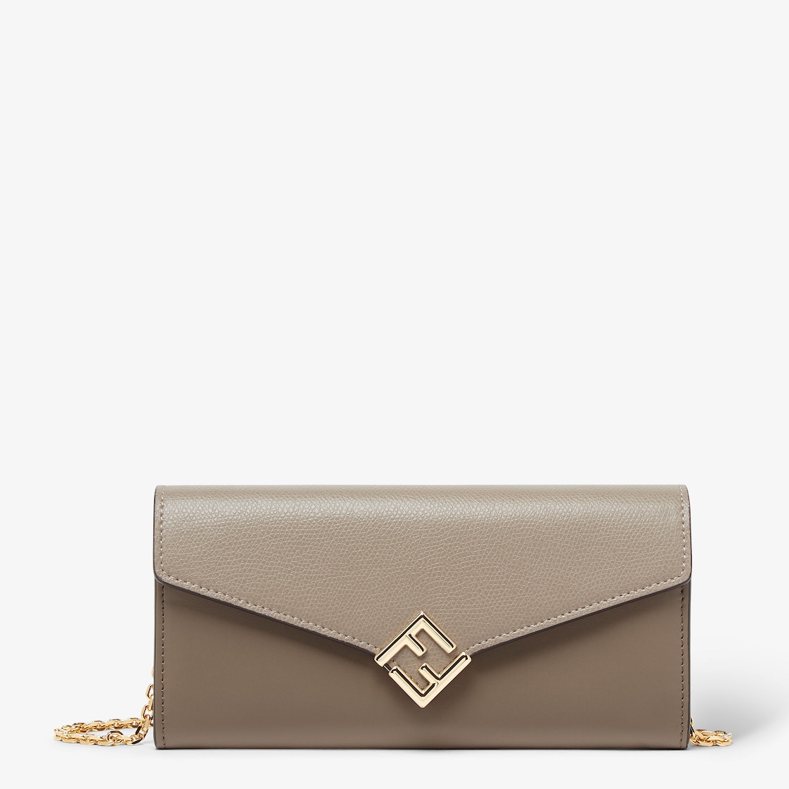 محفظة كونتيننتال FF Diamonds مع حزام كتف عبارة عن سلسلة رفيعة قابلة للفصل. يتميز القسم الداخلي بتصميم محفظة بقسمين، وتضم جيباً بسحاب، وجيبين مسطحين، وعشر فتحات للبطاقات. مصنوعة من الجلد باللون الرمادي مع فتحة باللون الرمادي الفاتح. زينة معدنية باللون الذهبي.