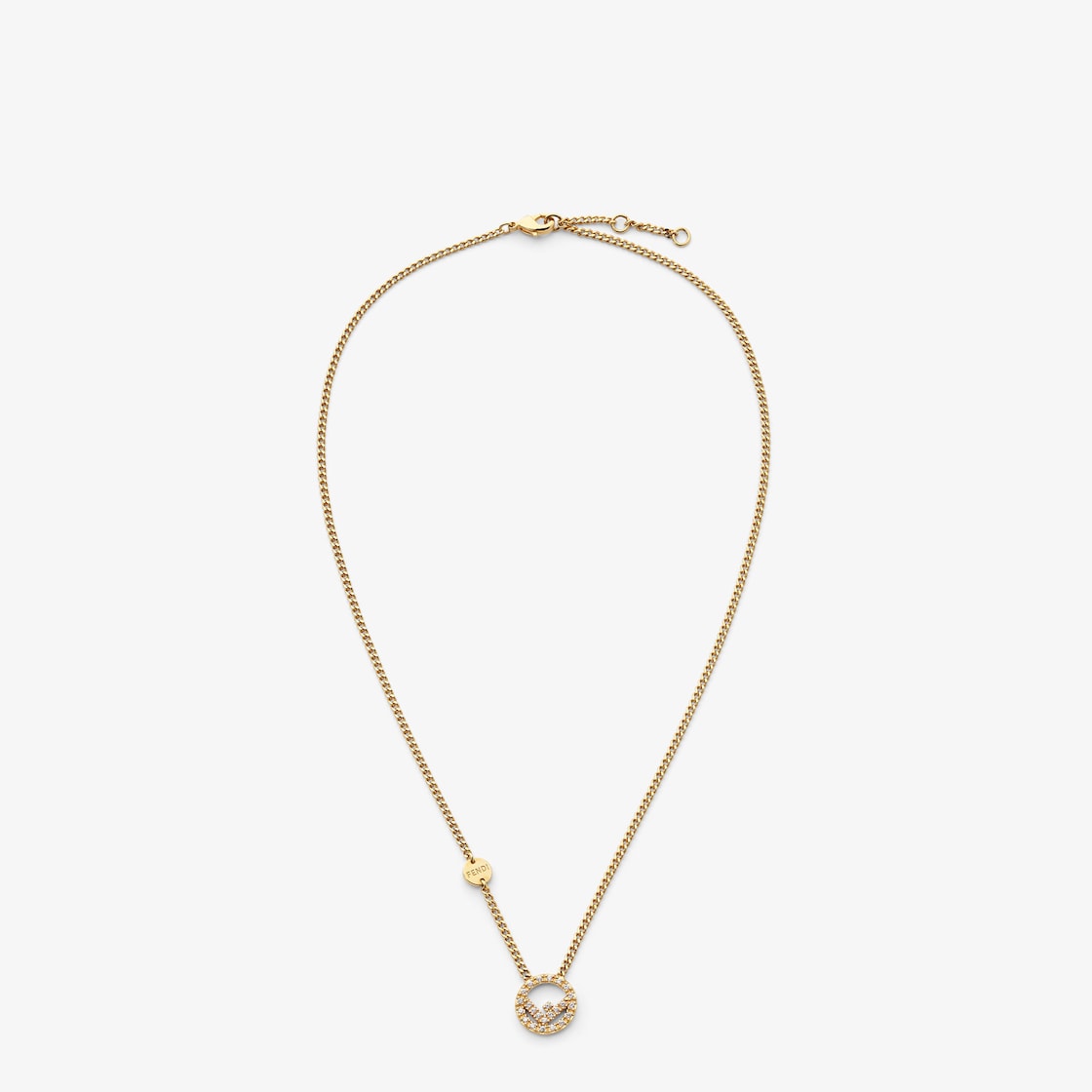 قلادة بسلسلة رفيعة مع ميدالية F is Fendi دائرية. مشبك قابل للتعديل. مصنوعة من المعدن باللون الذهبي وتفاصيل من الكريستال. علامة صغيرة مخصّصة في الجهة الأمامية.