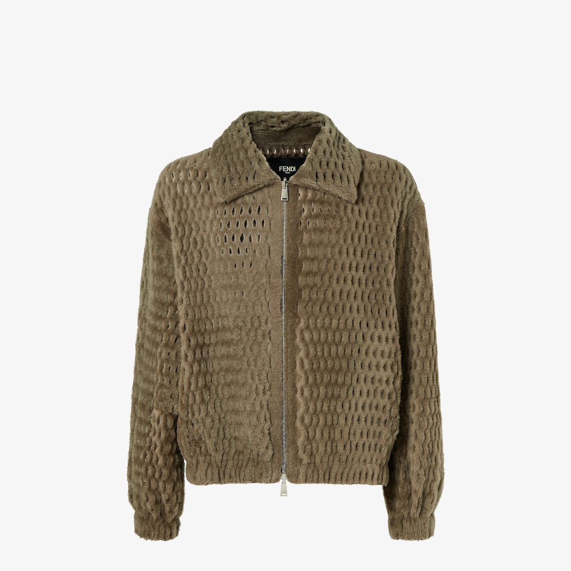 بلوزون قصير يُرتدى على الوجهين برقبة قميص وأكمام طويلة. جيبان جانبيان. أطراف أكمام مطاطية وطرف مطاطي. إغلاق بشريط سحاب معدني مزدوج في الجهة الأمامية. مصنوع من صوف الشيرلنج (shearling) باللون البيج مع تأثير خلية النحل، مقطّع ومخيّط من الداخل، ما يخفف من بنية التصميم ويشكّل تأثيراً شفافاً رقيقاً.