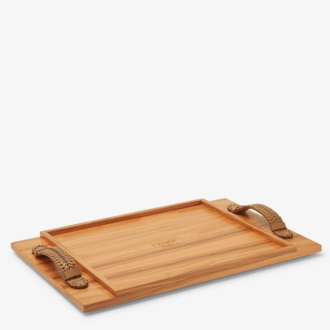 صينية مستطيلة مستوحاة من أحد تصاميم فندي الكلاسيكية من التسعينيات. مصنوعة من خشب الزيتون باللون البني الفاتح، مع مقبضين منسوجين يدوياً من جلد النابا (nappa) بدرجات مختلفة من اللون نفسه يذكّران بجدائل حقيبة Peekaboo الأيقونية. تضفي علامة Fendi Roma المحفورة لمسةً مميّزة في الوسط، في حين تضمن القواعد المستطيلة الأربعة في الزوايا الثبات والاستقرار. الخشب المُعالج يتمتع بقدرة على الاحتمال وهو مقاوم للخدش والاحتكاك، كما أنّه آمن لملامسة الطعام.