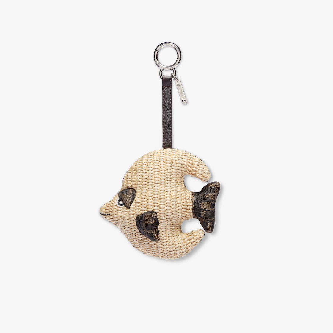 قلادة صغيرة على شكل سمكة من الرافيا (raffia) والنايلون (nylon) مع طبعة شعار FF بتأثير الجاكار بلون التبغ عليها بالكامل، وعينين من الجلد.