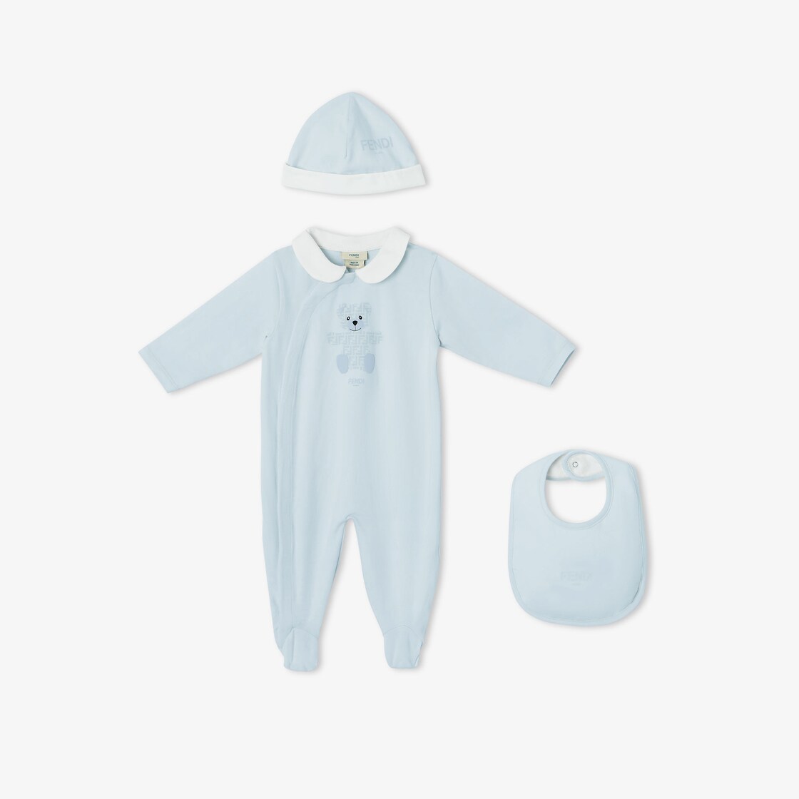 طقم للمواليد (من 0 إلى 24 شهراً) من الجيرسيه باللون الأزرق الفاتح يضم playsuit مع طبعة دب بدرجات مختلفة من اللون نفسه في الجهة الأمامية، وقبعة ومريلة بلون متناسق عليهما علامة Fendi Roma.