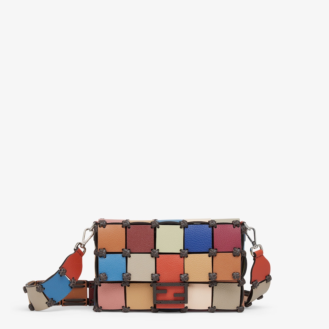 مصنوعة بالكامل بنمط الجمع بين أشكال مختلفة من جلد العجل كويو رومانو (Cuoio Romano) متعدد الألوان من مجموعات فندي السابقة. كل مربّع مقصوص ومجهّز ومنسوج يدوياً مع شرائط من الجلد باللون البني الداكن. فتحة مربعة من الجلد وإغلاق مغناطيسي مع علامة FF.