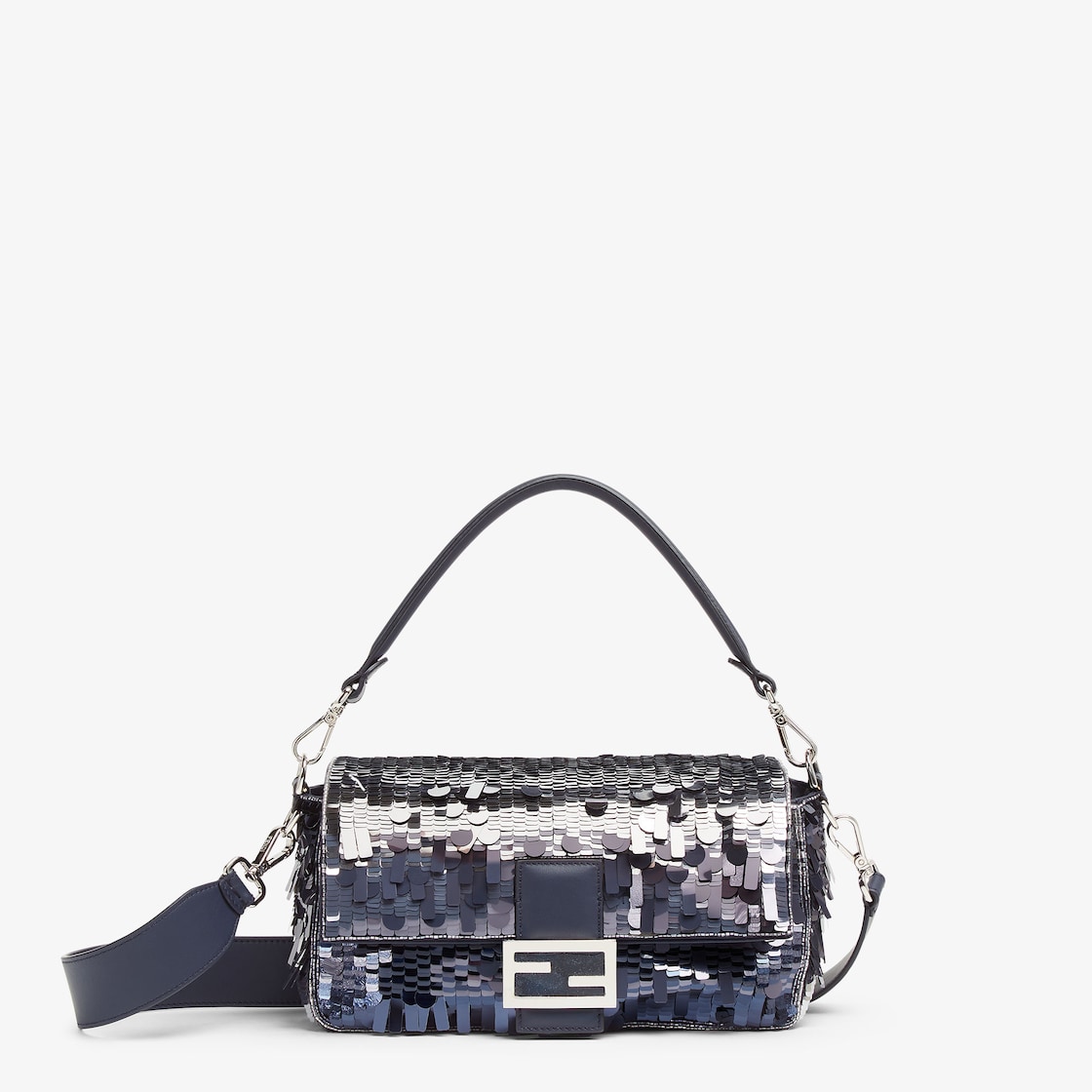 حقيبة Baguette الأيقونية بحجم متوسط، مع قطع ترتر معدنية بأحجام وأشكال مختلفة على كامل القطعة، تشكّل زخرفة بتأثير متدرج بلون أزرق. مزينة بمشبك FF.