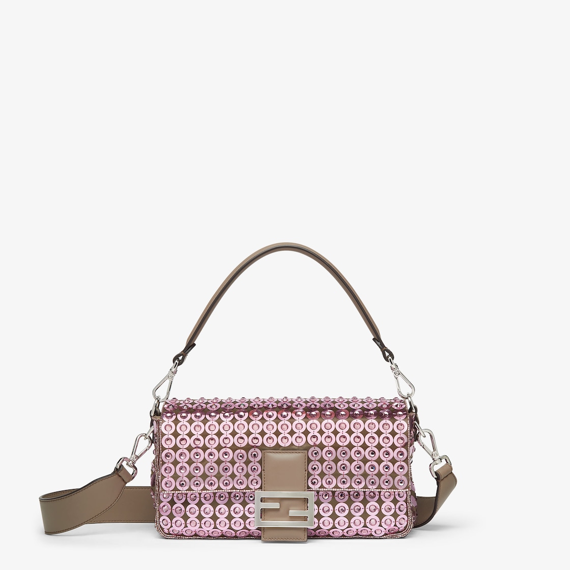 مصنوعة من الساتان (satin) باللون البيج، ومطرزة بالكامل بخرز وأحجار راين باللون الوردي. مزيّنة بمشبك FF.
