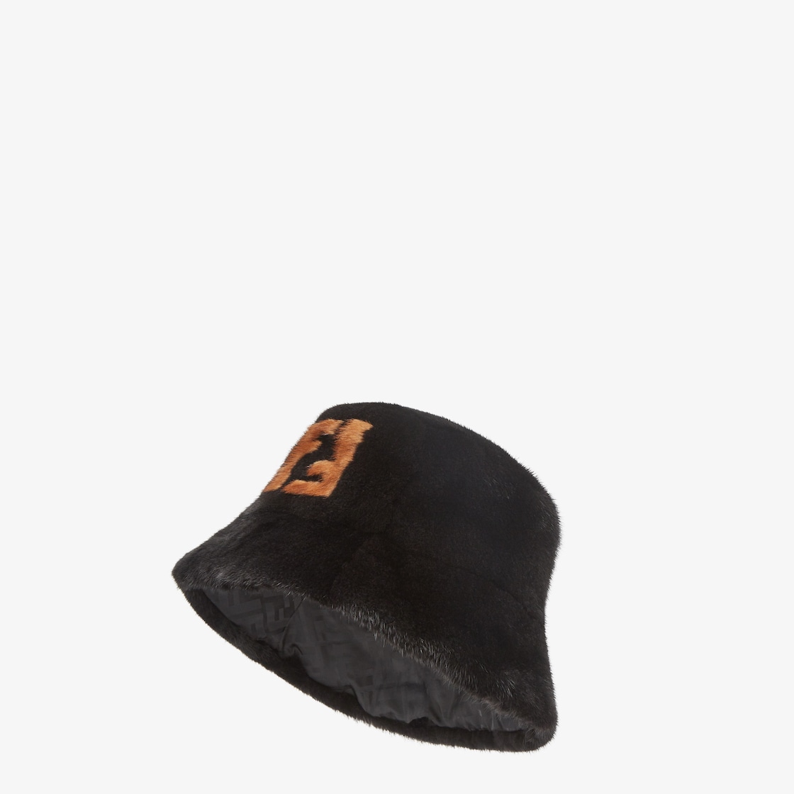 قبعة باكيت تُرتدى على الوجهين بحواف واسعة قابلة للطي. مصنوعة من منك بلون أسود مزيّن بزخرفة FF مرصّعة باللون البني، جزء من التشكيلة التي تم تحضيرها مع ستيفانو بيلاتي.