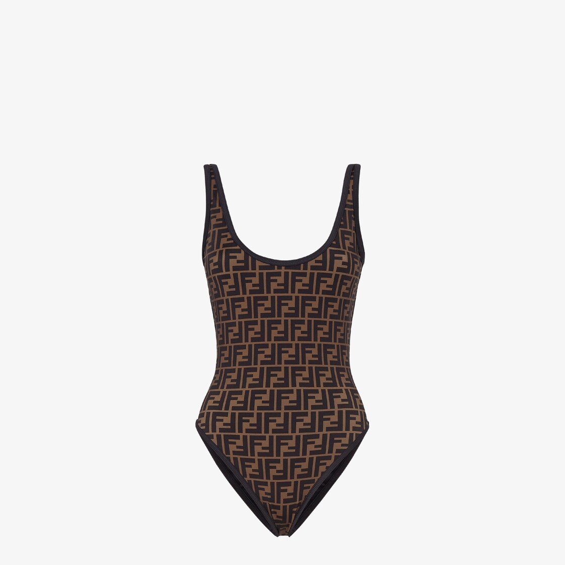 ملابس سباحة تُرتدى على الوجهين مصنوعة من ®Lycra باللون البني مع علامة FF عليها بالكامل. مزينة بتفاصيل من اللون الأسود المتباين. جيب برباط متناسق مع علامة فندي على الجهة الأمامية.