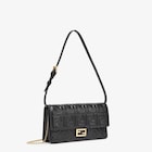 محفظة Baguette صغيرة بفتحة ومشبك FF. يضم القسم الداخلي ست فتحات للبطاقات. حزام كتف مزدوج، أحدهما قابل للتعديل من الجلد والآخر سلسلة رفيعة قابلة للفصل، لحمل الحقيبة مثل حقيبة clutch أو تحت الذراع أو ارتداؤها cross-body. مصنوعة من جلد النابا (nappa) باللون الأسود مع علامة FF منقّشة. زينة معدنية باللون الذهبي.